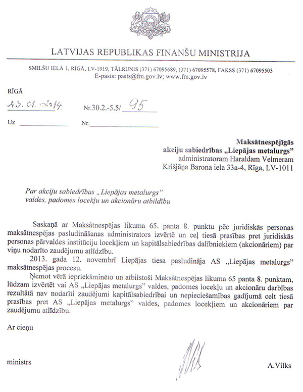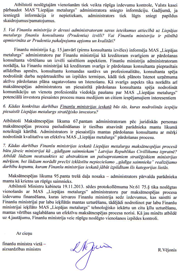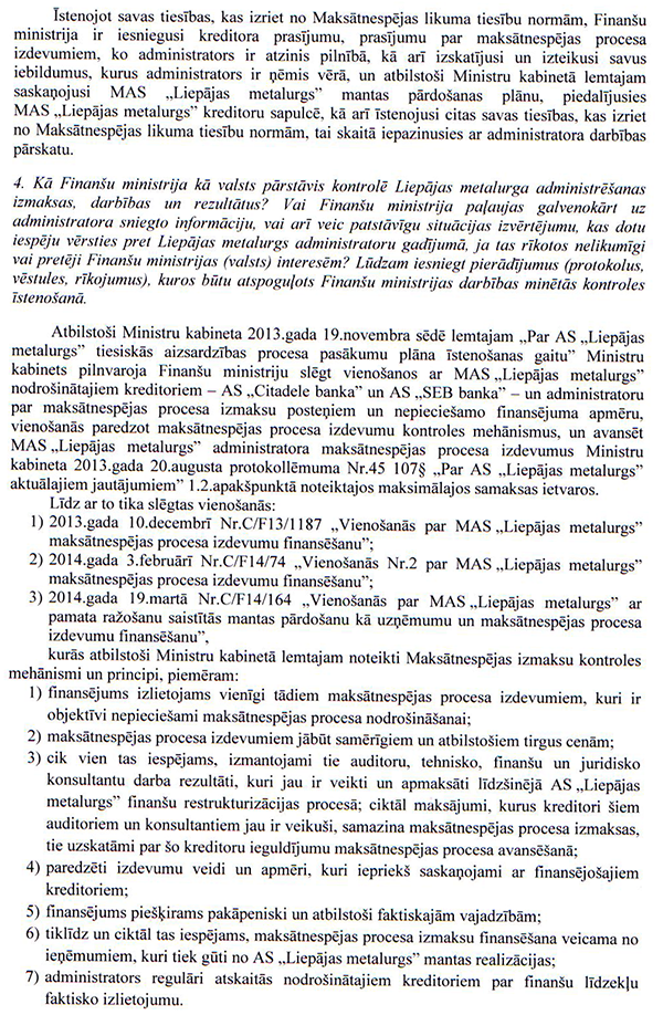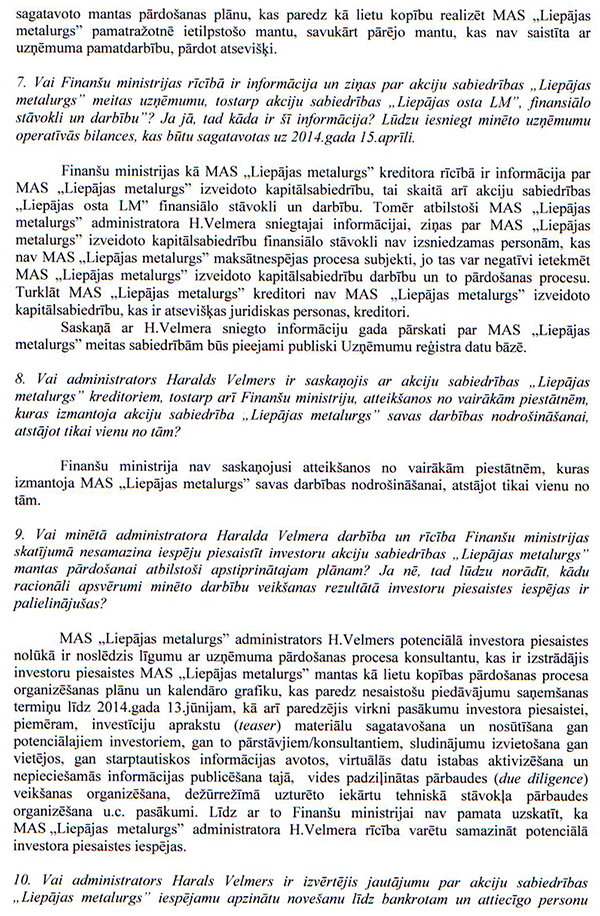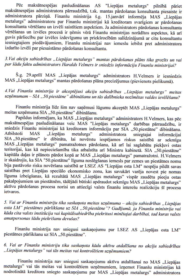 Tas jautājums... Nu, mēs tomēr esam atbildējuši, ka Finanšu ministrijai kā "Liepājas metalurga" nodrošinātajam kreditoram ir pieejama informācija par šo "Liepājas metalurga" izveidoto kapitālsabiedrību, bet šī informācija nav izpaužama... izsniedzama... izpaužama personām, kas nav saistītas ar maksātnespējas procesa, tā teikt, subjektu, jo tas var ietekmēt tālāko kopējo "Liepājas metalurga"... teiksim, projekta realizācijas gaitu. Līdz ar to šī informācija nav sniedzama.