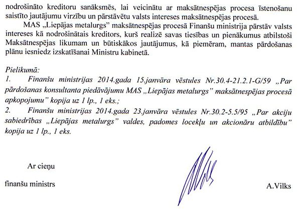 A.Vilks. Nu, mēs vadāmies pēc tā, ka mēs zinām konkrētu datumu, līdz kuram ir jāsniedz "Liepājas metalurga" administratoram ziņojums gan Finanšu ministrijai, gan arī Ministru kabinetam par iesniegtajiem pieprasījumiem attiecībā uz "Liepājas metalurga" darbības atjaunošanu un potenciālajiem investoriem. Līdz šim tā sadarbība ir bijusi tāda: mēs, Finanšu ministrija un Valsts kase, esam no Ministru kabineta saņēmuši instrukciju sadarboties ar "Liepājas metalurga" administratoru.