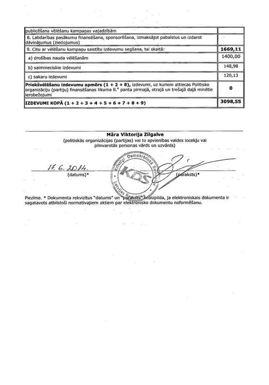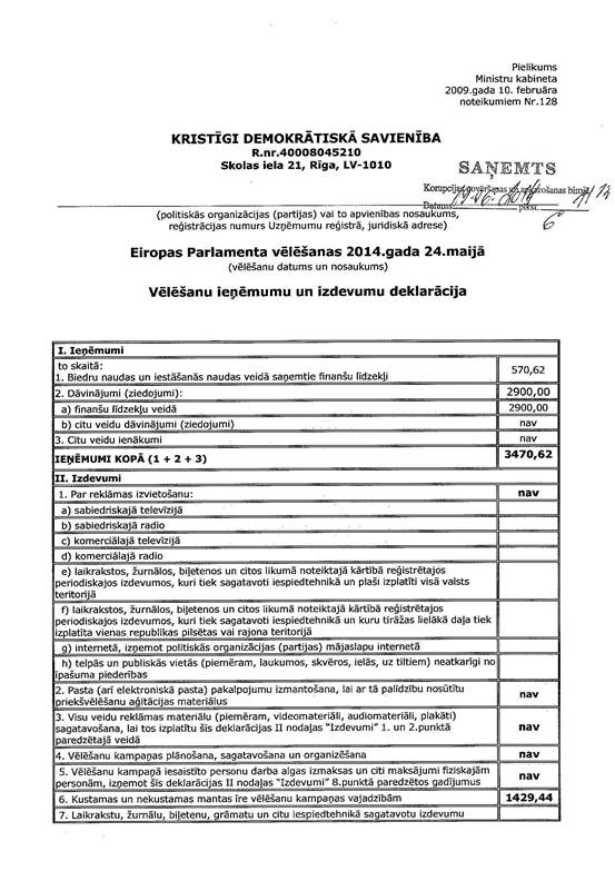 Politiskās partijas "Kristīgi demokrātiskā savienība", reģ. Nr.40008045210, 2014.gada 24.maija Eiropas Parlamenta vēlēšanu ieņēmumu un izdevumu deklarācija