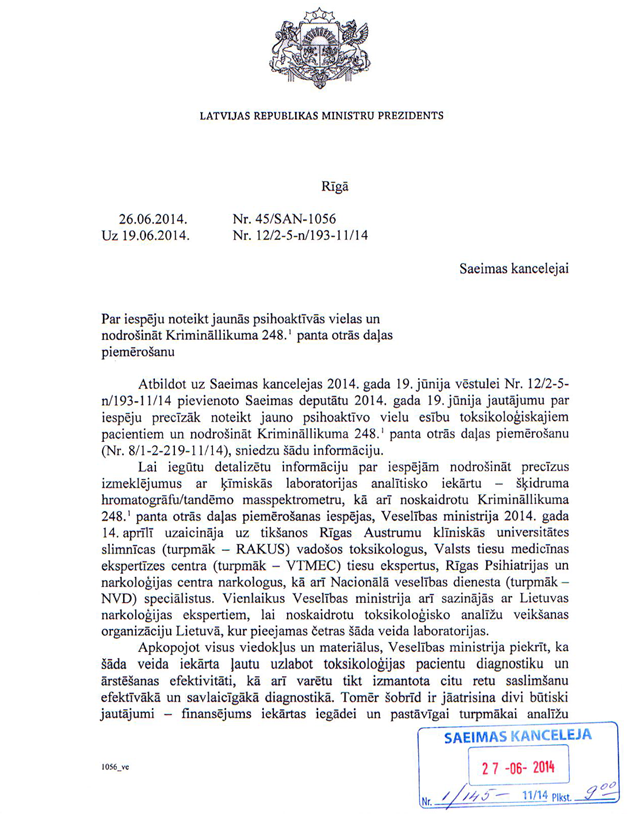 Godātie kolēģi! Otrajā lasījumā izskatām grozījumus likumā "Par Krimināllikuma spēkā stāšanās un piemērošanas kārtību". Es vēlos jums atgādināt, ka pagājušajā gadā mēs noteicām pagaidu aizliegumu jaunām psihoaktīvām vielām, kas paredz, ka gada laikā Slimību profilakses un kontroles centram ir jāveic pārbaude attiecīgajām vielām, lai noskaidrotu, vai tās ir atzīstamas... vai ir pamats atzīt attiecīgās vielas par psihotropām vai par narkotiskām. Un šodien mēs labojam... pareizāk būtu teikt, grozām likumu "Par Krimināllikuma spēkā stāšanās un piemērošanas kārtību", kas paredz papildināt aizliegto vielu sarakstu ar 18 grupām; proti, vielas, kurām bija noteikts pagaidu aizliegums, kļūst par pilnīgi aizliegtām.