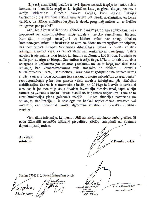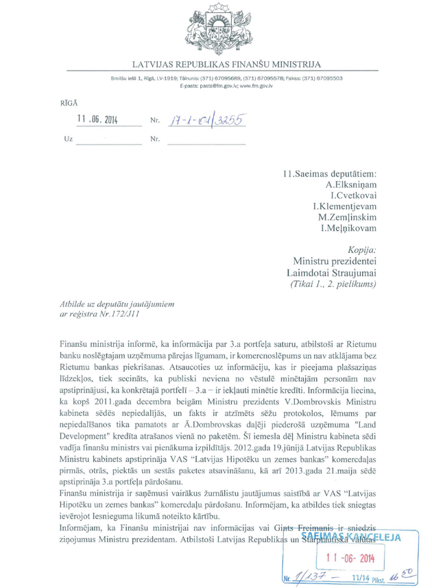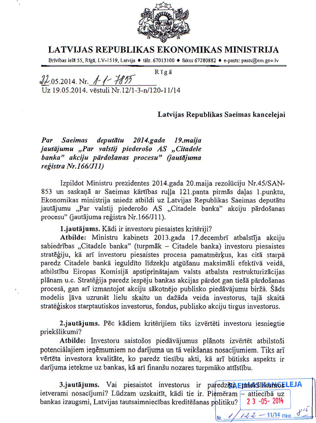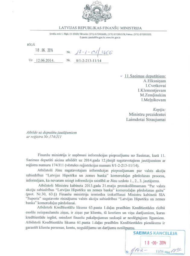 Uzklausot iesniedzēju prasības, komisijas locekļi vienojās uzaicināt uz iesnieguma tālākas izvērtēšanas sēdi Finanšu ministrijas pārstāvjus, lai noskaidrotu viņu viedokli par šo ierosinājumu. Lai vispusīgāk izvērtētu minēto jautājumu, 2014.gada 23.aprīlī Saeimas Mandātu, ētikas un iesniegumu komisiju apmeklēja Finanšu ministrijas parlamentārā sekretāre Lolita Čigāne, Finanšu ministrijas padomnieks finanšu kontroles jautājumos Reinis Strolis un Finanšu ministrijas valsts sekretāra vietnieks Ilmārs Šņucins.