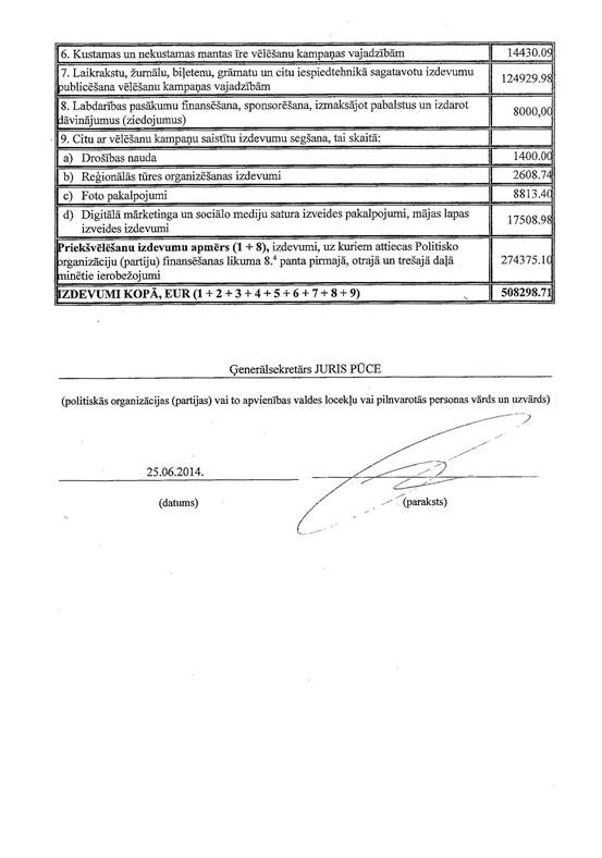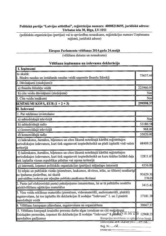 Politiskās partijas "Latvijas attīstībai", reģ.Nr.40008218695, 2014.gada 24.maija Eiropas Parlamenta vēlēšanu ieņēmumu un izdevumu deklarācija