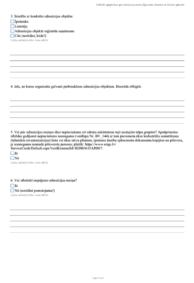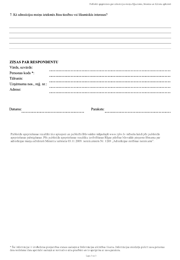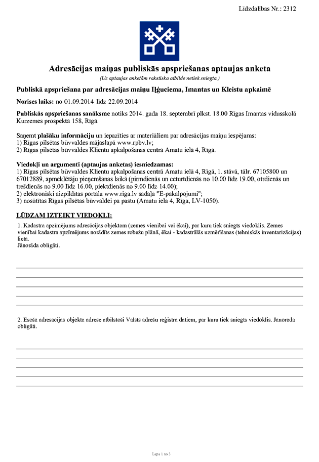 Būvvalde aicina lēmuma par šī lēmuma 1. un 2. pielikumā norādīto zemes vienību un ēku adrešu maiņu un 3. pielikumā norādīto zemes vienību un ēku adrešu piešķiršanu iespējamos adresātus no 2014. gada 1. septembra līdz 22. septembrim iepazīties ar publiskajai apspriešanai nodoto informāciju un izteikt viedokli, aizpildot aptaujas anketu un iesniedzot to Būvvaldes Klientu apkalpošanas centrā Rīgā, Amatu ielā 4, 1. stāvā, tālruņi 67105800 un 67012889, apmeklētāju pieņemšanas laikā (pirmdienās un ceturtdienās no 10.00 līdz 19.00, otrdienās un trešdienās no 9.00 līdz 16.00, piektdienās no 9.00 līdz 14.00) vai nosūtot Būvvaldei pa pastu (Amatu iela 4, Rīga, LV-1050). Aptaujas anketas iespējams aizpildīt arī elektroniski portāla www.riga.lv sadaļā "E-pakalpojumi". Rakstveidā aizpildāmas aptaujas anketas pieejamas Būvvaldes Klientu apkalpošanas centrā un Būvvaldes mājaslapā www.rpbv.lv.