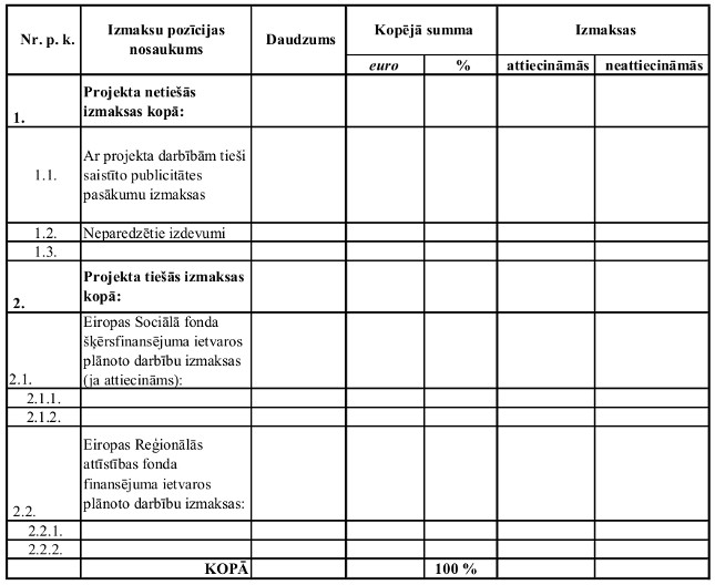 | 21. | Projekta budžetā iekļautās izmaksas ir samērīgas un pamatotas, tās atbilst paredzētajam projekta īstenošanas laikposmam un darbību apjomam un ir aprēķinātas, ņemot vērā prognozētās tirgus cenas attiecīgajā projekta īstenošanas gadā | P |