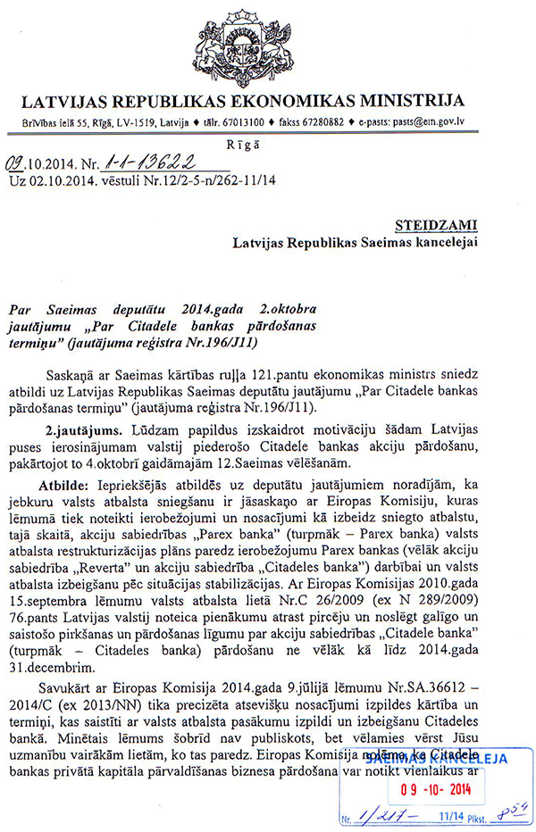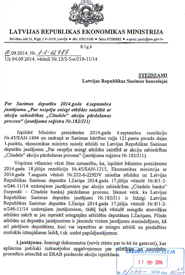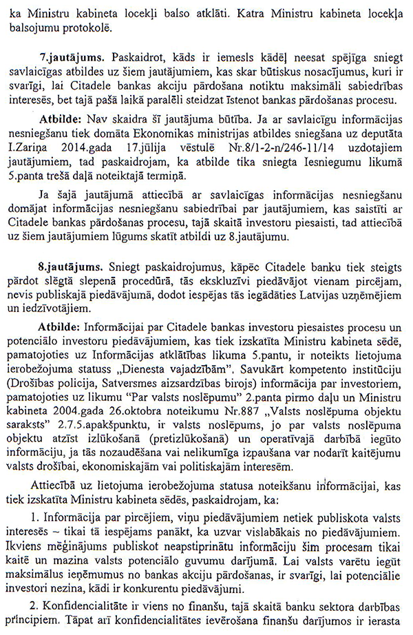 Saeimas Prezidijs ir saņēmis deputātu Elksniņa, Zemļinska, Tutina, Zariņa, Ribakova un citu iesniegto lēmuma projektu "Par uzdevumu Ministru kabinetam panākt līgumā par bankas "Citadele" akciju pārdošanu noteiktu nosacījumu iekļaušanu". Tātad – vai deputātiem ir iebildumi, ka šis jautājums tiktu skatīts šīsdienas sēdē? Vai deputātiem... Vai deputāti piekrīt, ka šis jautājums tiek skatīts nākamajā kārtējā sēdē? Nē, deputāti nepiekrīt. Vai jūs lūdzat balsojumu?