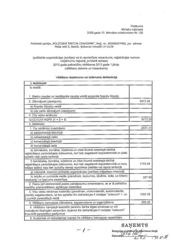 Politiskās partijas "POLITISKĀ PARTIJA IZAUGSME" precizēta 2013.gada 1.jūnija pašvaldību vēlēšanu ieņēmumu un izdevumu deklarācija