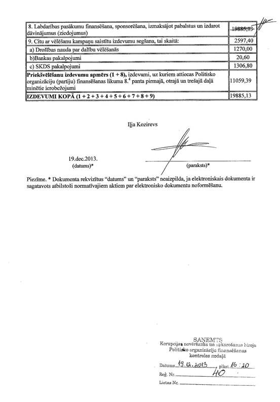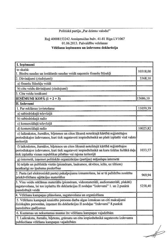 Politiskās partijas "Par dzimto valodu!" precizēta 2013.gada 1.jūnija pašvaldību vēlēšanu ieņēmumu un izdevumu deklarācija