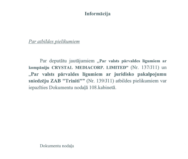 Pirms mēs slēdzam šo sēdi, es vēlos informēt, ka deputāti bija uzdevuši vairākus jautājumus gan Ministru prezidentei, gan ministriem. Atbildes ir sniegtas, jautājumu iesniedzēji nav vēlējušies uzdot papildjautājumus. Līdz ar to šovakar pulksten 17.00 mutvārdu atbilžu sniegšana netiks rīkota.
