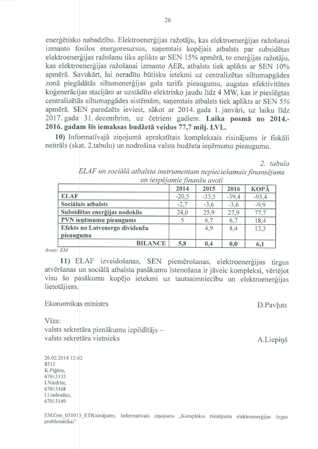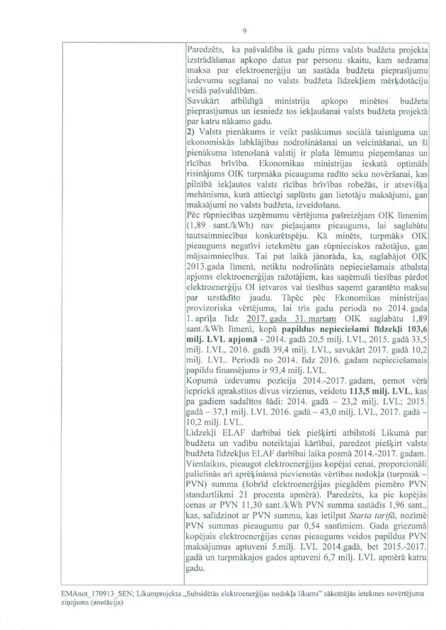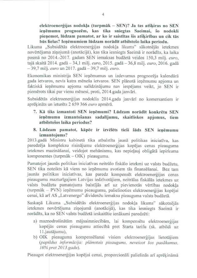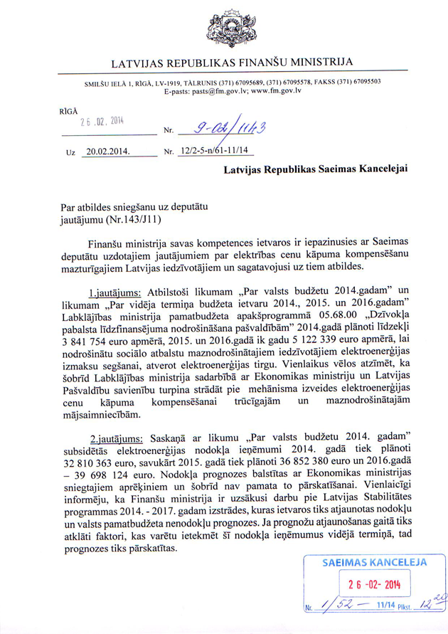 Tātad ir jautājums finanšu ministram Andrim Vilkam "Par elektrības cenu kāpuma kompensēšanu mazturīgajiem Latvijas iedzīvotājiem". Uz šo jautājumu ir saņemta rakstveida atbilde, kas iesniedzējus gan neapmierina, bet papildjautājumus viņi uzdot nevēlas. Tas nozīmē, ka jautājums uzskatāms par atbildētu.