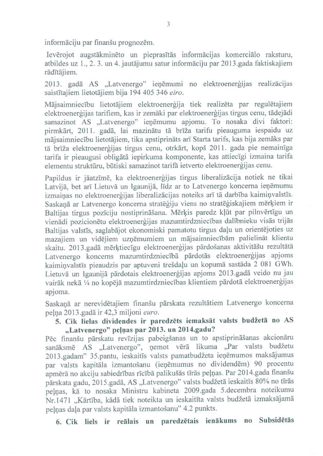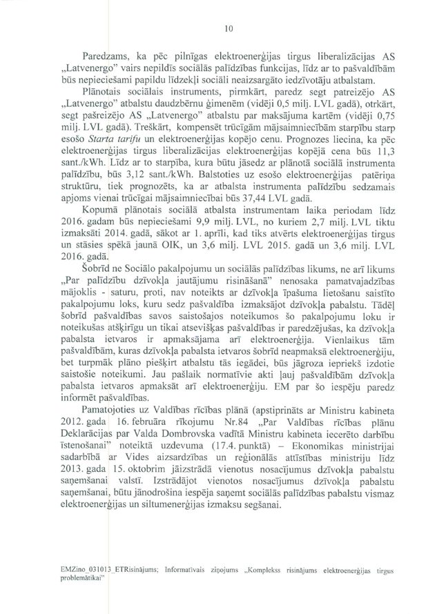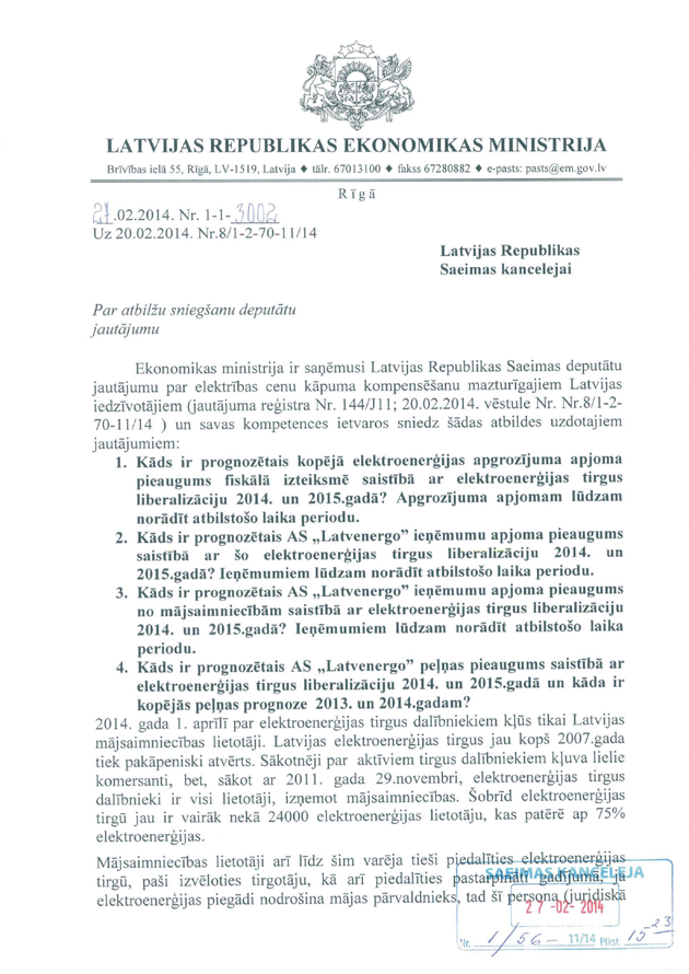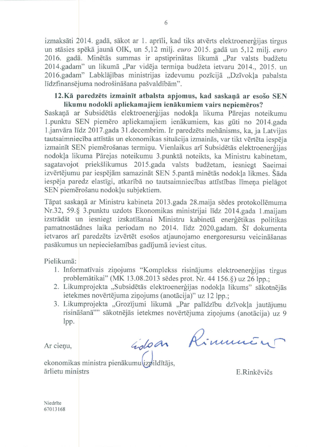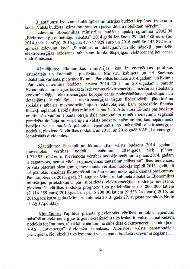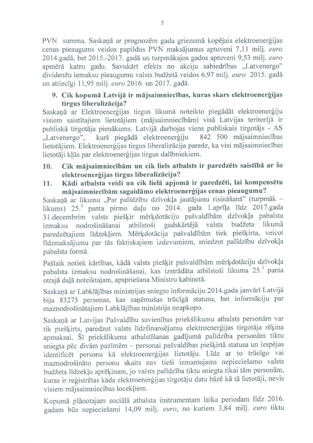 Tāpat ir deputātu jautājums ministram Vjačeslavam Dombrovskim "Par elektrības cenu kāpuma kompensēšanu mazturīgajiem Latvijas iedzīvotājiem". Arī šeit saņemtā rakstveida atbilde iesniedzējus neapmierina, un arī šajā gadījumā viņi nevēlas uzdot papildjautājumus. Tātad arī šis jautājums uzskatāms par atbildētu.