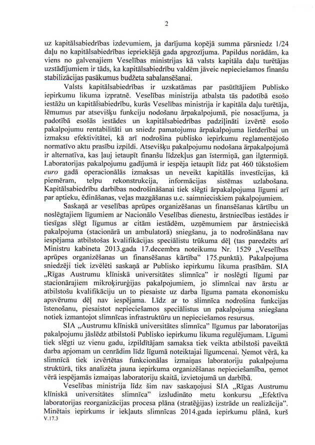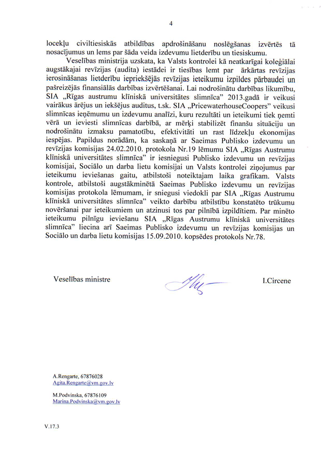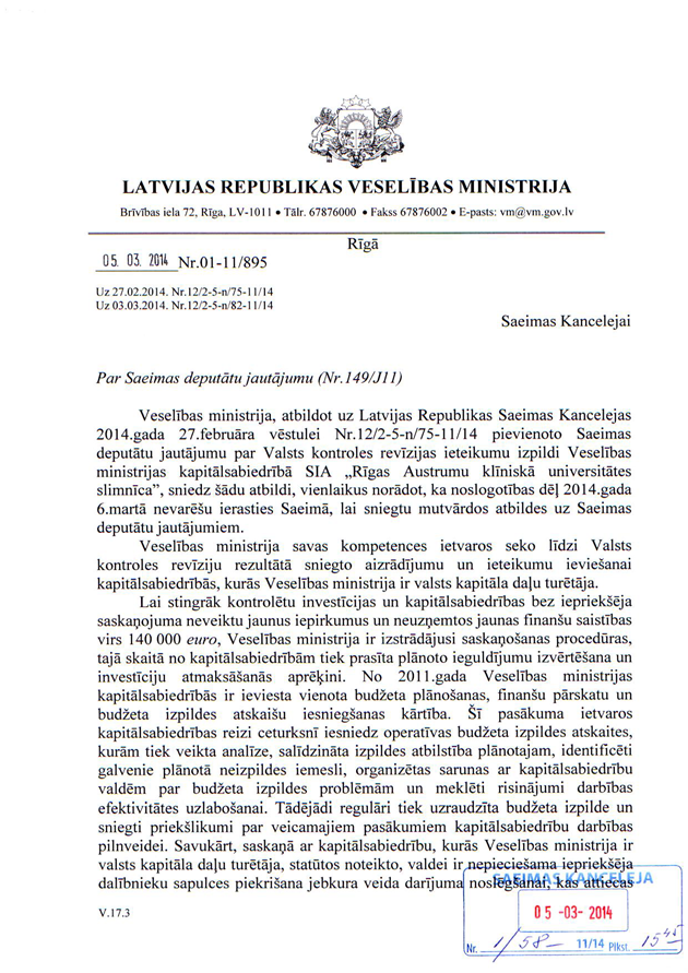 Deputātu jautājums veselības ministrei Ingrīdai Circenei "Par Valsts kontroles revīzijas ieteikumu izpildi Veselības ministrijas kapitālsabiedrībā SIA "Rīgas Austrumu klīniskā universitātes slimnīca"". Ir saņemta rakstveida atbilde, kas iesniedzējus neapmierina, bet viņi nevēlas uzdot papildjautājumus. Tātad jautājums uzskatāms par atbildētu.
