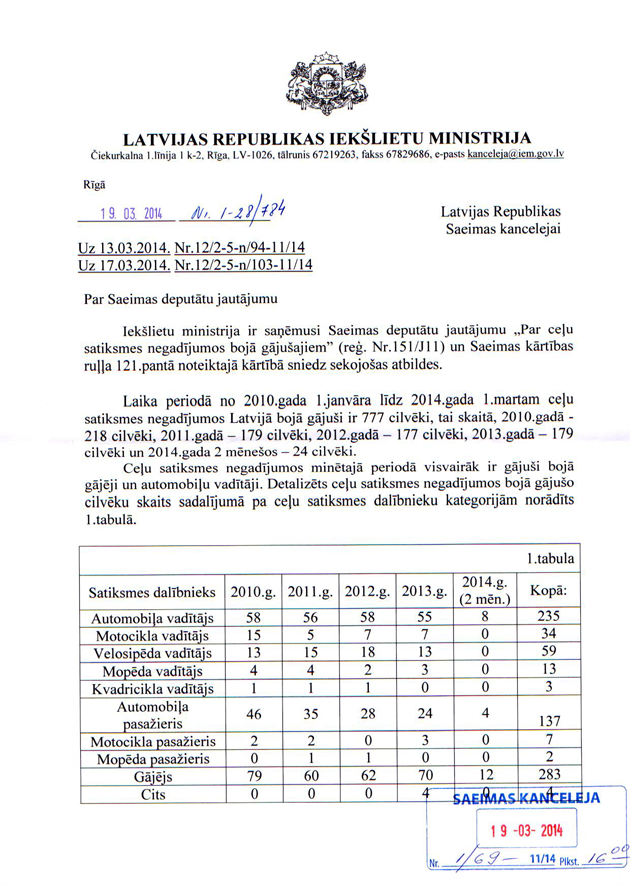 Deputātu jautājums iekšlietu ministram Rihardam Kozlovskim "Par ceļu satiksmes negadījumos bojā gājušajiem". Saņemtā rakstveida atbilde iesniedzējus apmierina. Jautājums uzskatāms par atbildētu.