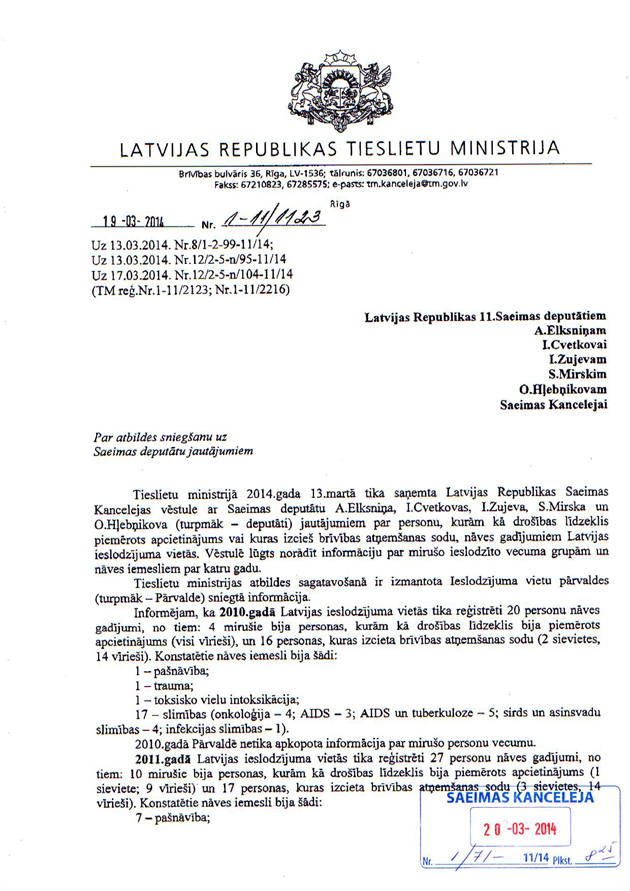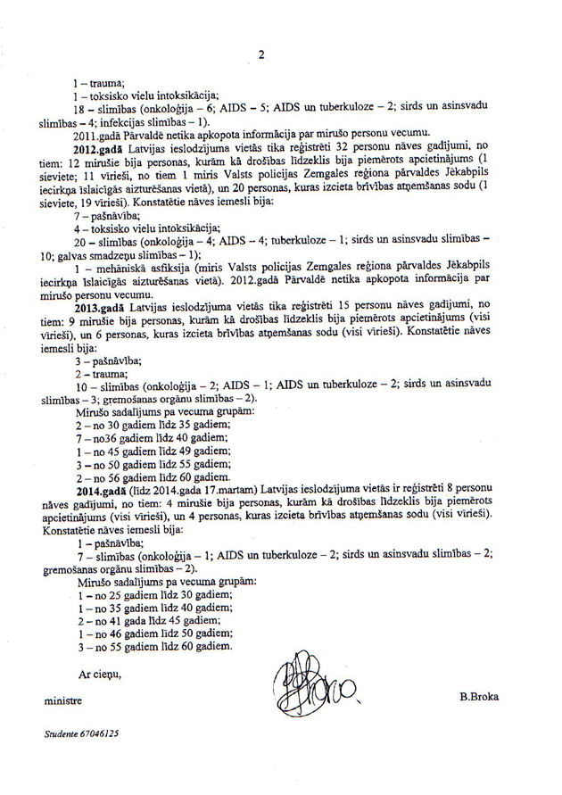 Un deputātu jautājums tieslietu ministrei Baibai Brokai "Par ieslodzījuma vietās mirušajiem". Arī ir saņemta rakstveida atbilde, kas iesniedzējus apmierina. Tātad arī šis jautājums ir uzskatāms par atbildētu.
