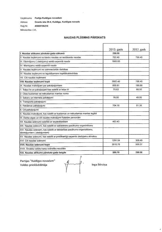 Politiskās partijas "Kuldīgas novadam", reģ.Nr.40008196218, gada pārskats par 2013.gadu