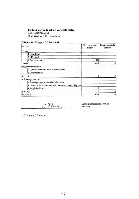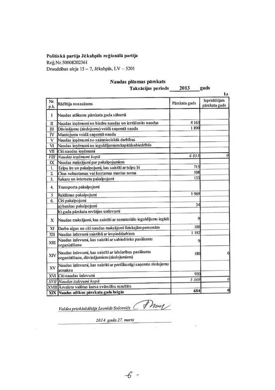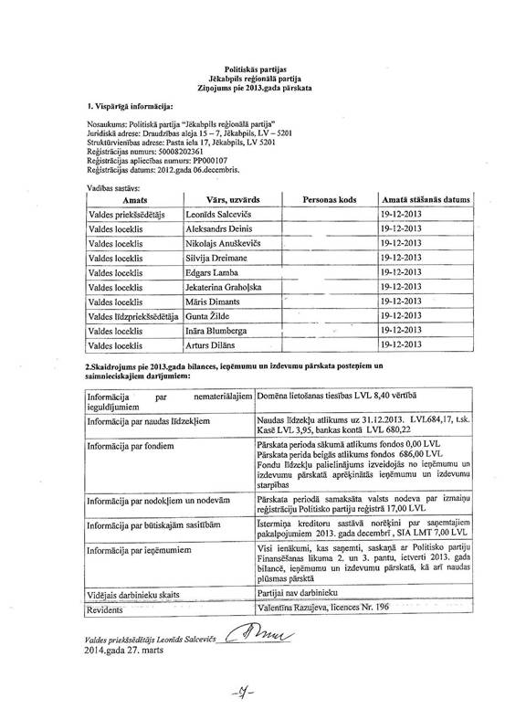 Politiskās partijas "JĒKABPILS REĢIONĀLĀ PARTIJA", reģ.Nr.50008202361, gada pārskats par 2013.gadu