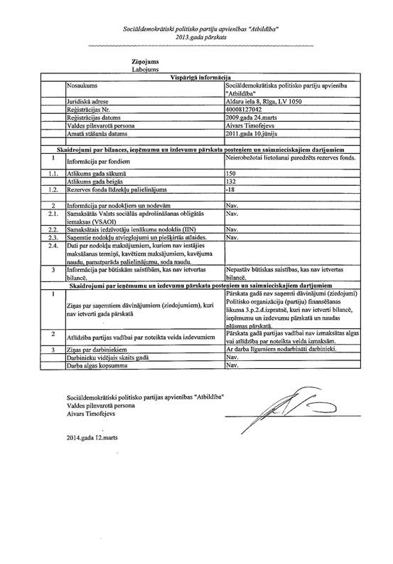 Politisko partiju apvienības "ATBILDĪBA - sociāldemokrātiska politisko partiju apvienība", reģ.Nr.40008127042, gada pārskats par 2013.gadu