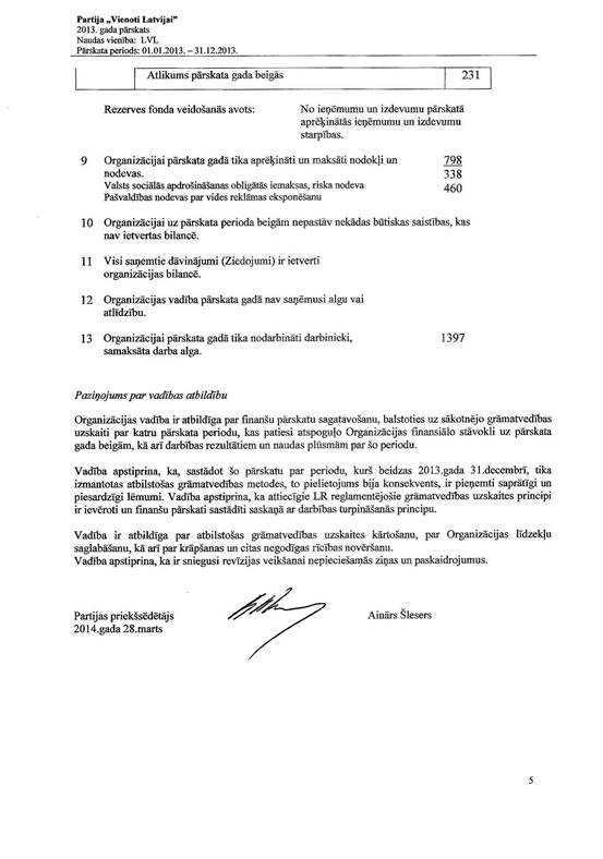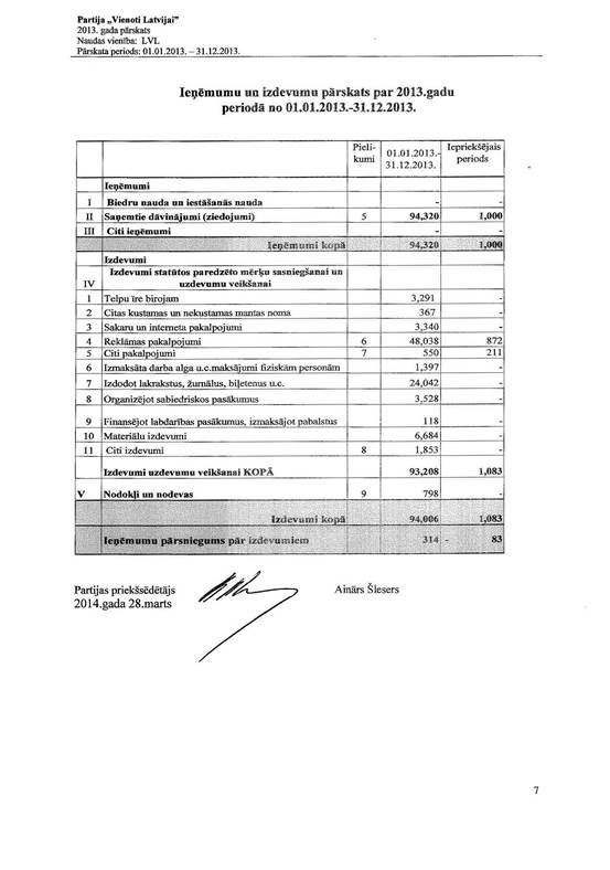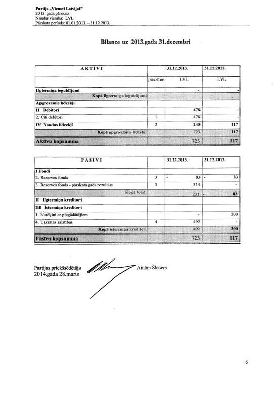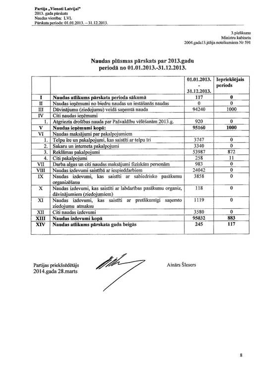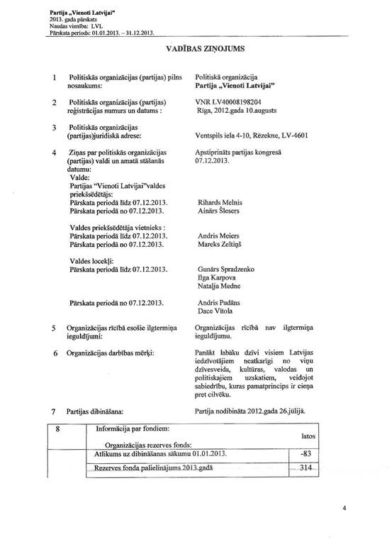 Politiskās partijas "Vienoti Latvijai", reģ. Nr. 40008198204, gada pārskats par 2013.gadu