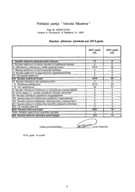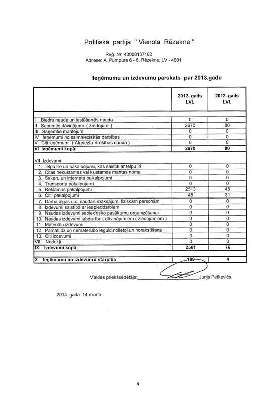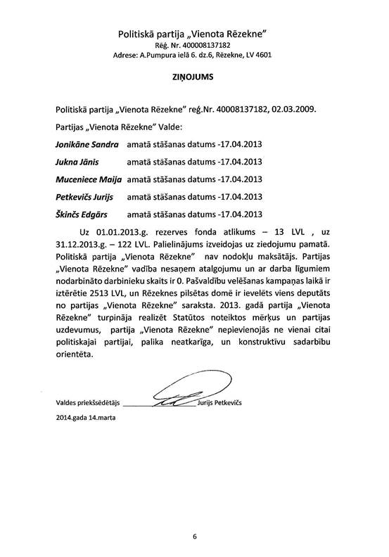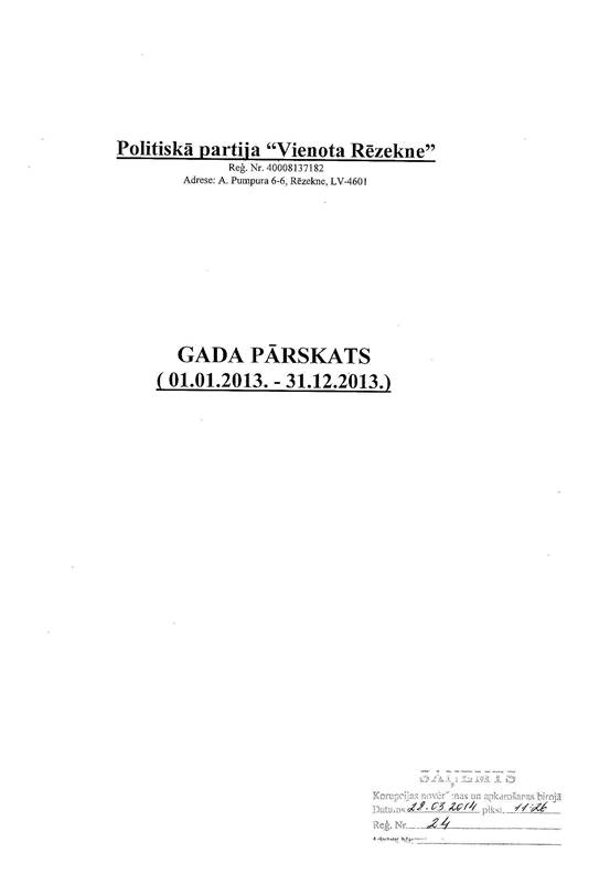 Politiskās partijas "Vienota Rēzekne", reģ. Nr. 40008137182, gada pārskats par 2013.gadu