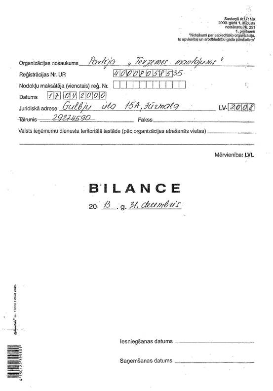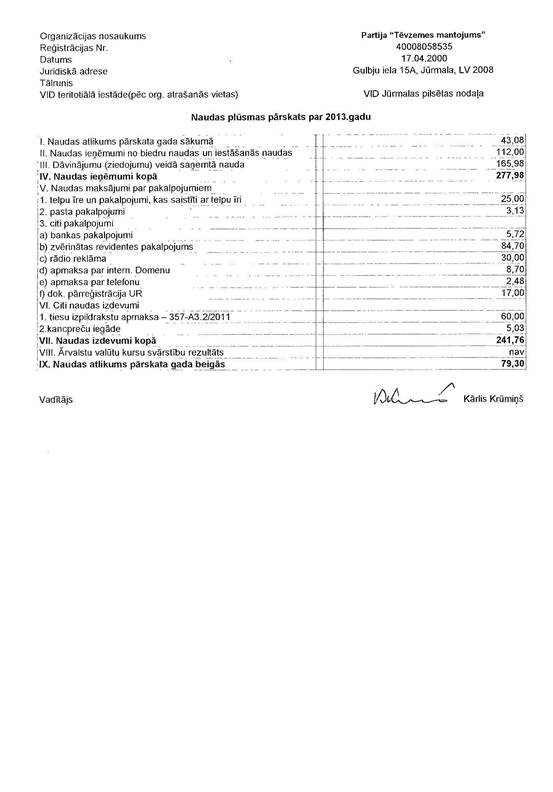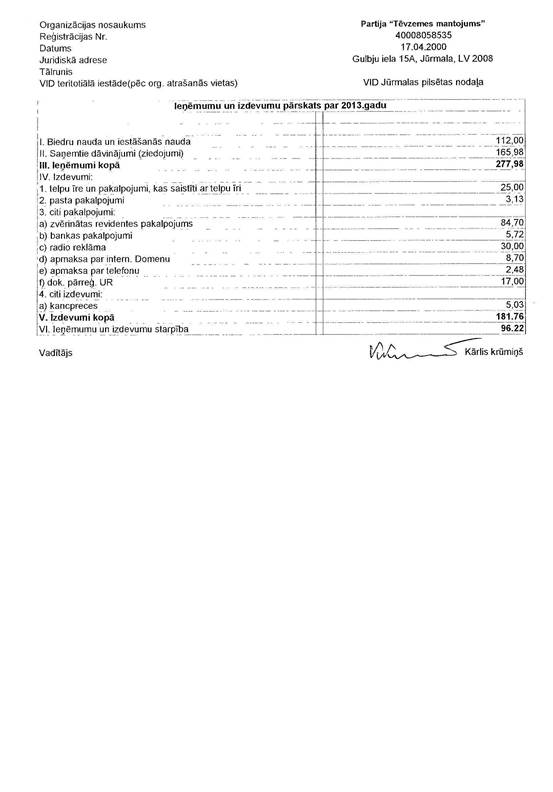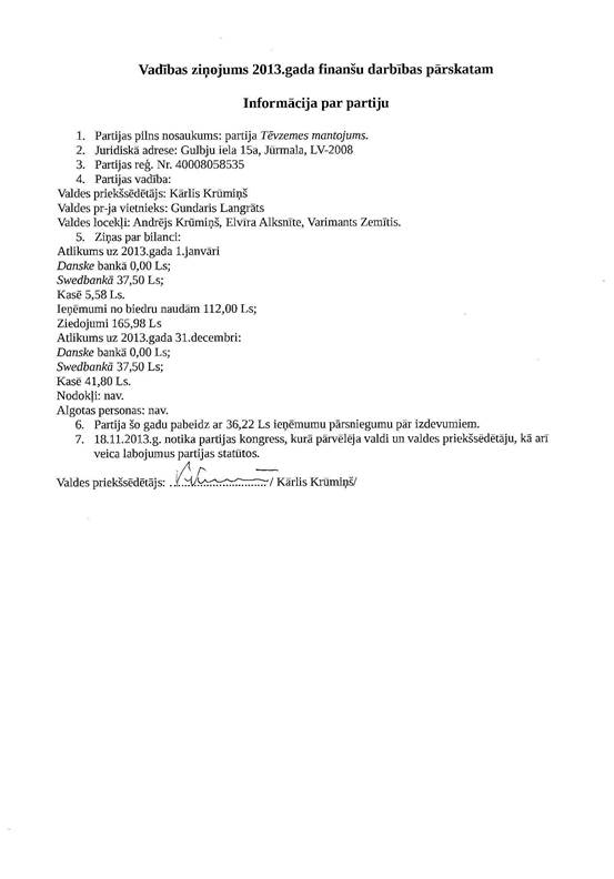 Politiskās partijas "Tēvzemes mantojums", reģ.Nr.40008058535, gada pārskats par 2013.gadu