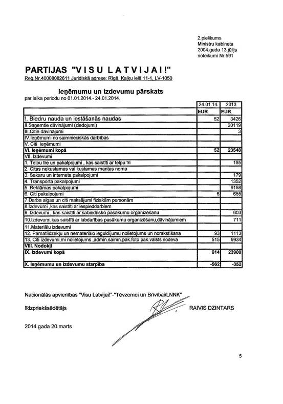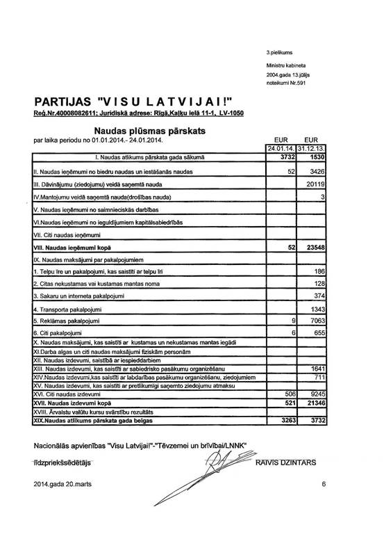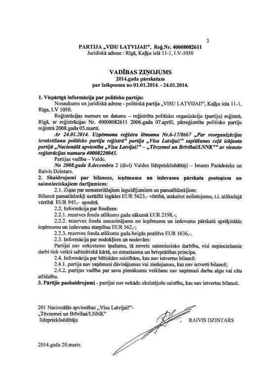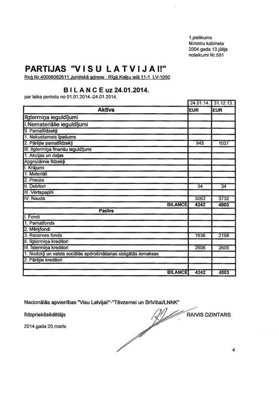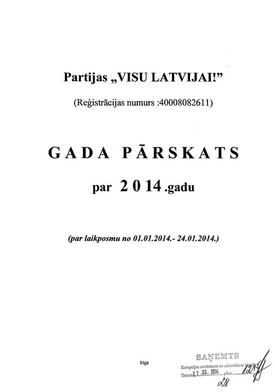 Politiskās partijas "Visu Latvijai!", reģ. Nr.40008082611, gada pārskats par 2014.gadu (par laika posmu no 01.01.2014. līdz 24.01.2014.)
