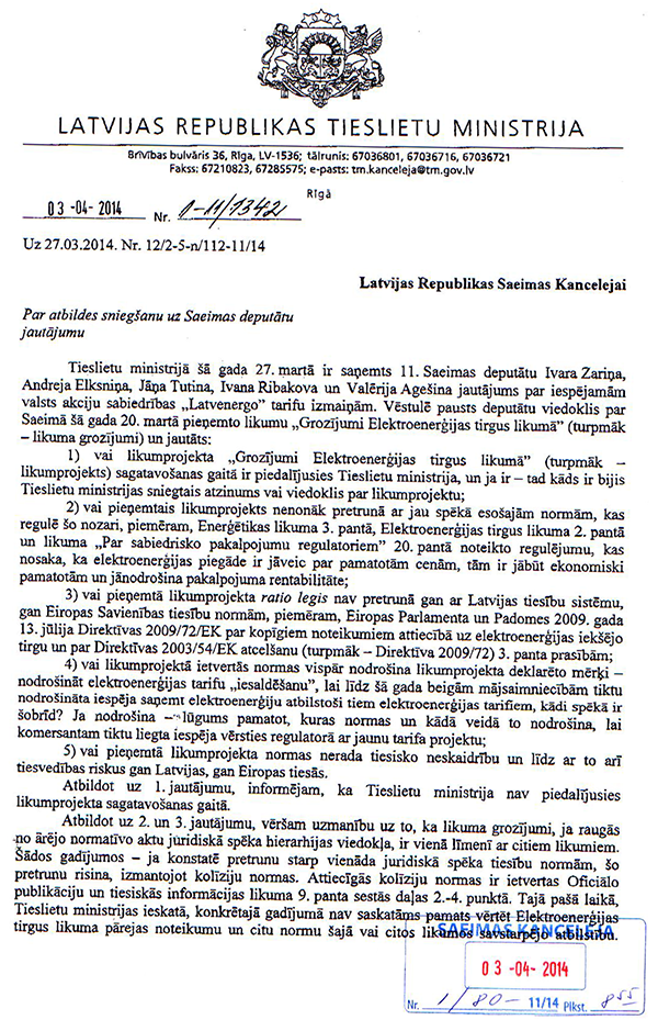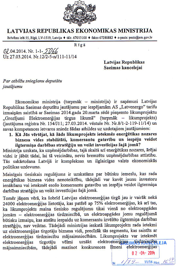 Tātad 20.martā tika pieņemti grozījumi Elektroenerģijas tirgus likumā. Savā atbildē, ministra kungs, jūs korekti uzskaitāt, kuri ir tie lēmumi, kas saistībā ar šiem grozījumiem būtu jāievēro "Latvenergo", lai tiktu nodrošināta šī tarifu iesaldēšana. No šiem visiem lēmumiem, jūs atzīstat, tieši šis pēdējais SPRK lēmums, kas tika pieņemts 2011.gada 16.februārī, ir tas lēmums, kurš nodrošinās elektroenerģijas tarifu nemainību "Latvenergo" saistītajiem lietotājiem. To, ka lēmums ir pieņemts klusējot, jūs pamatojat ar Latvijas Republikas Augstākās tiesas Senāta spriedumu, kam mēs piekrītam, tomēr mēs vēršam jūsu uzmanību uz to, ka šinī spriedumā šis lēmums ir pieņemts nevis par tarifu iesaldēšanu, bet gan par tarifu atbilstību metodikai un to, ka tie ir ekonomiski pamatoti. Tādējādi tas nozīmē, ka arī šis lēmums neuzliek nekādus ierobežojumus "Latvenergo" iesniegt jaunu tarifu projektu. Pat vēl vairāk! Šie jūsu minētie lēmumi, par kuriem jūs sakāt, ka "Latvenergo" tie ir jāievēro, uzliek par pienākumu "Latvenergo" iesniegt jaunu tarifu projektu. Tā ka...