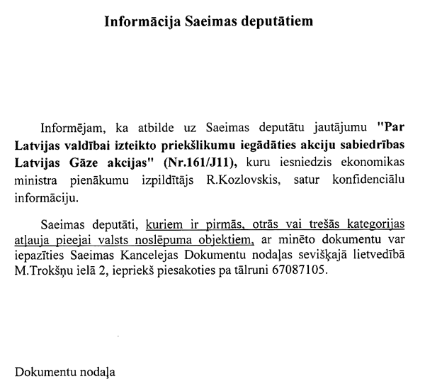 Šodien darba kārtībā mums ir viens deputātu jautājums, kuru iesniedza Zariņš, Nikonovs, Mirskis, Hļebņikovs un Pimenovs, – jautājums Ministru prezidentei Laimdotai Straujumai "Par Latvijas valdībai izteikto priekšlikumu iegādāties akciju sabiedrības "Latvijas Gāze" akcijas".