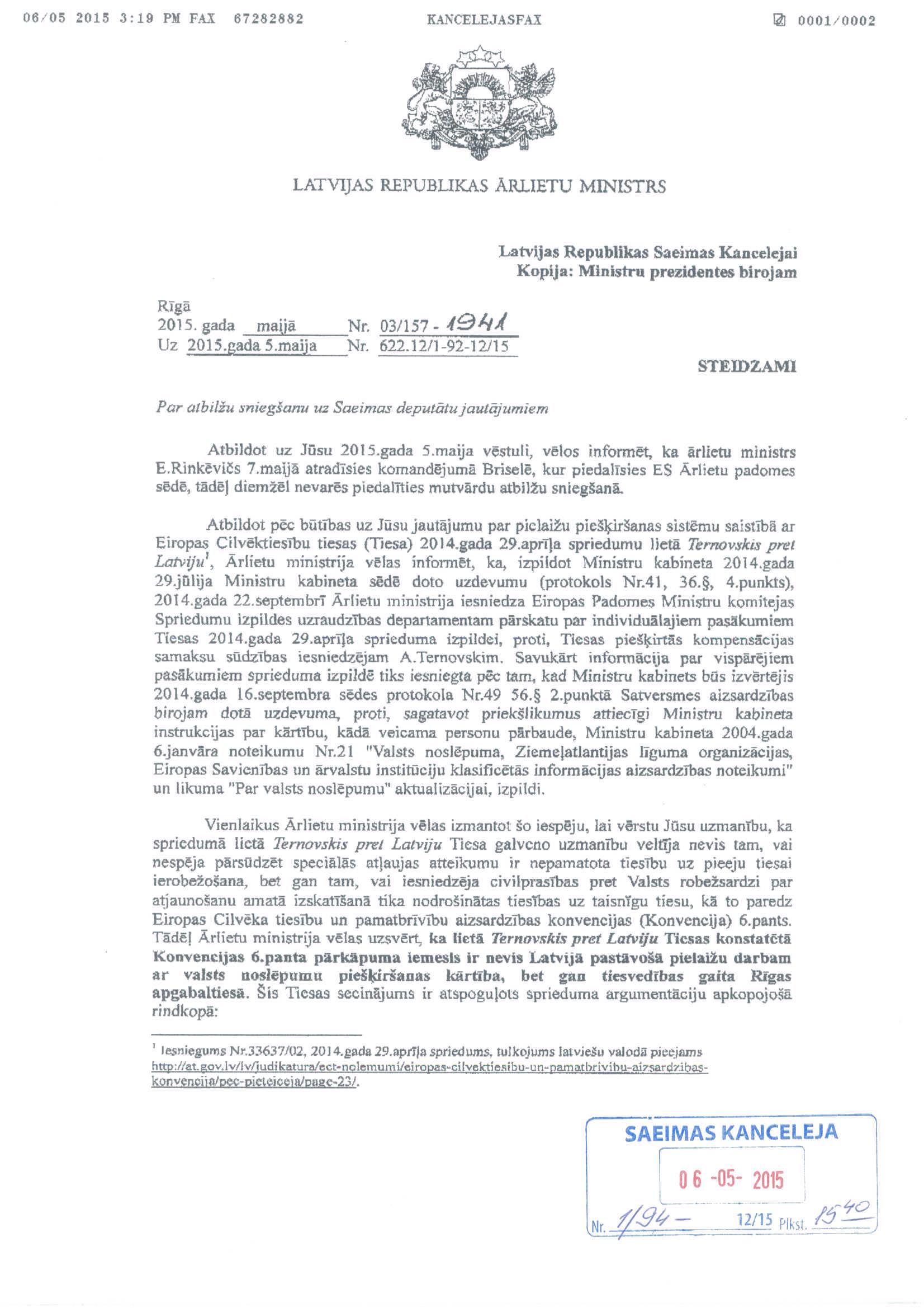 Jautājums ir tāds. Jūs savā atbildē norādījāt, ka Eiropas Cilvēktiesību tiesa lietā "Ternovskis pret Latviju" nesaskatīja konvencijas 6.panta pārkāpumu. Un galvenais, protams, bija tas, ka Rīgas apgabaltiesa nav nodrošinājusi personai reālu tiesas procesu... bet ka ECT nav vērtējusi jautājumu par speciālo atļauju neizsniegšanas kārtību.