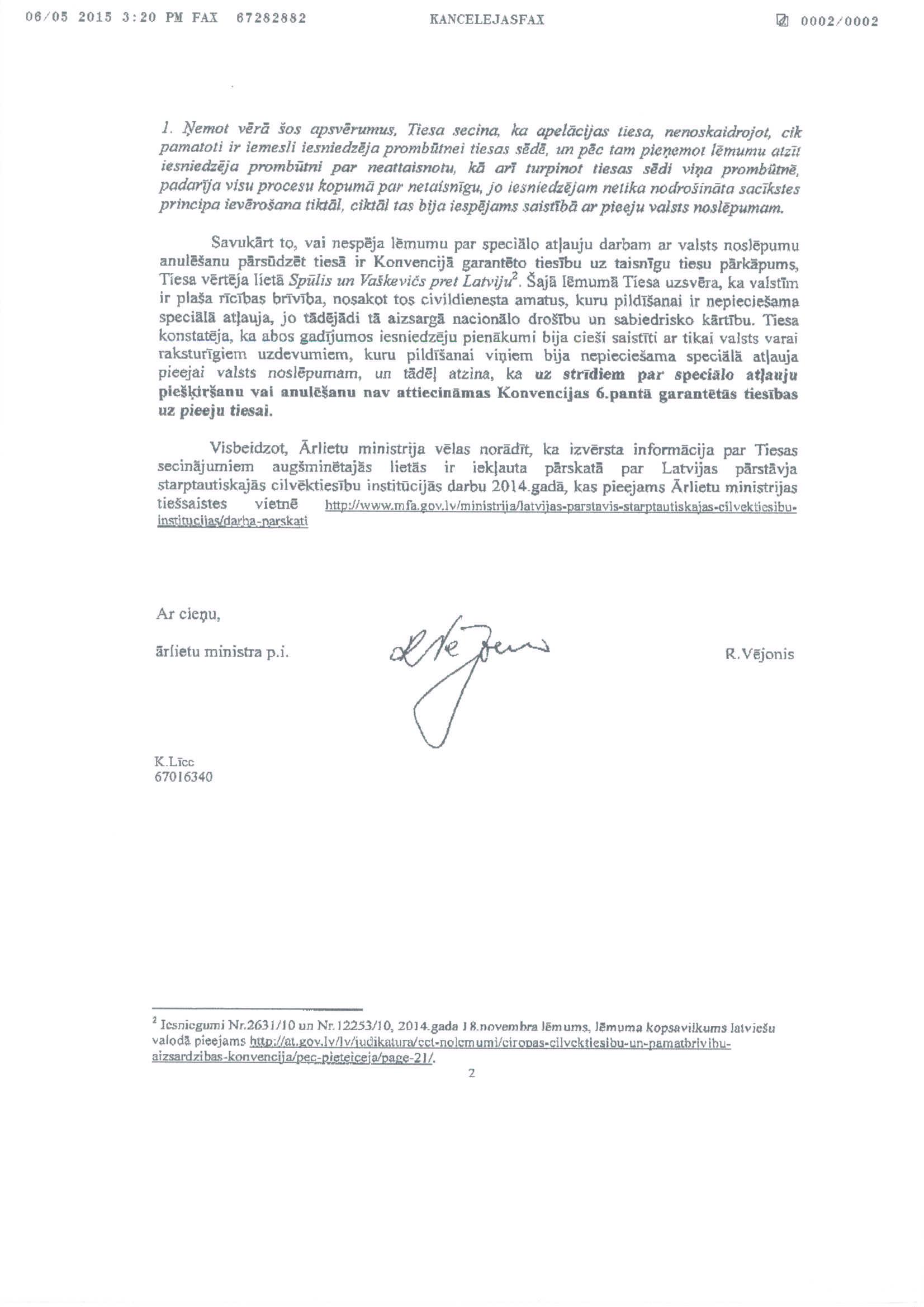 Ja runājam par Tieslietu ministrijas vērtējumu, tad jāteic, ka Tieslietu ministrijas vērtējums ir tāds, ka ir bijuši rupji pārkāpumi civilprocesā, nav nodrošināta šī sacīkste, līdz ar to ir bijis cilvēktiesību pārkāpums. Tiesības uz taisnīgu tiesu.
