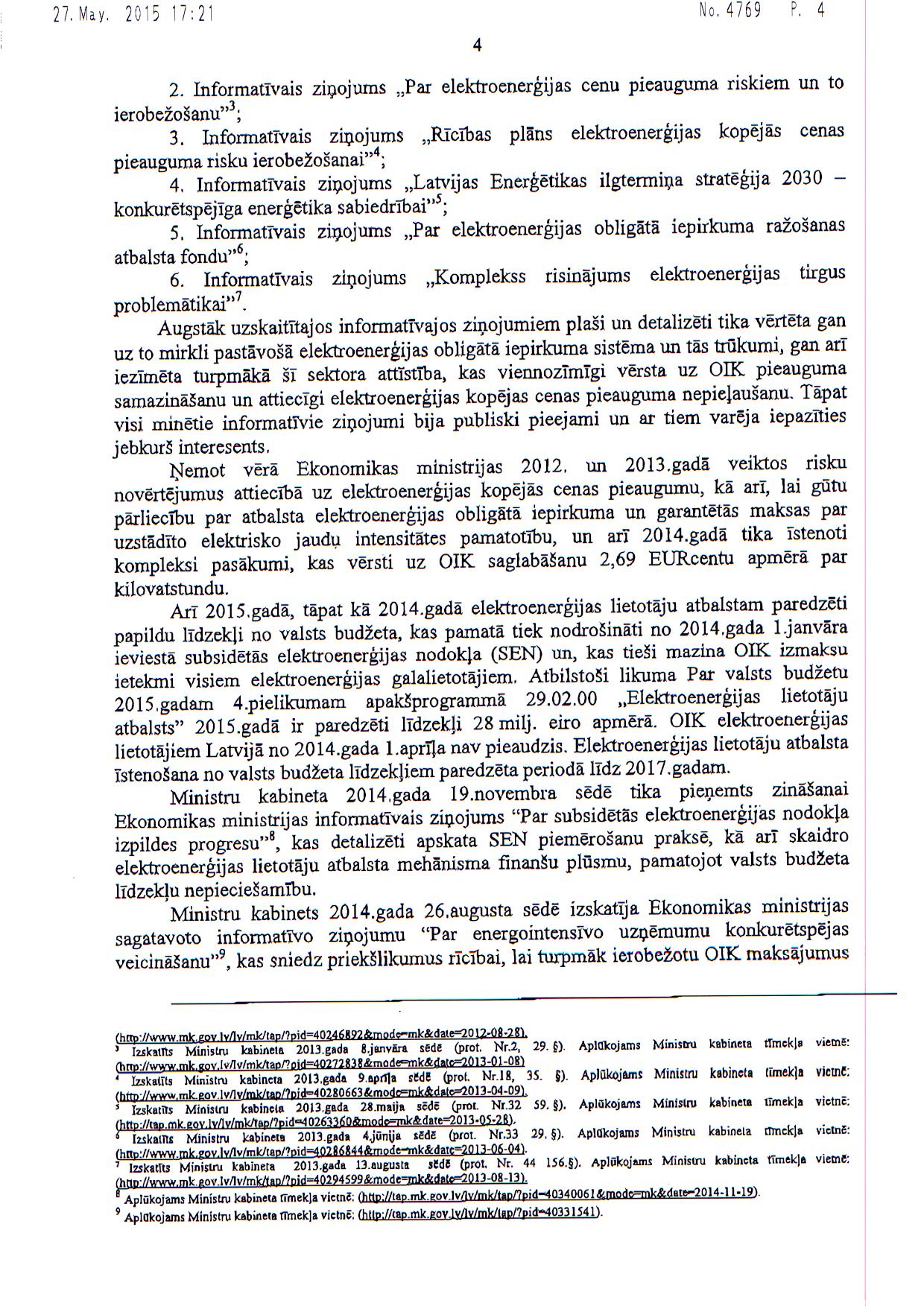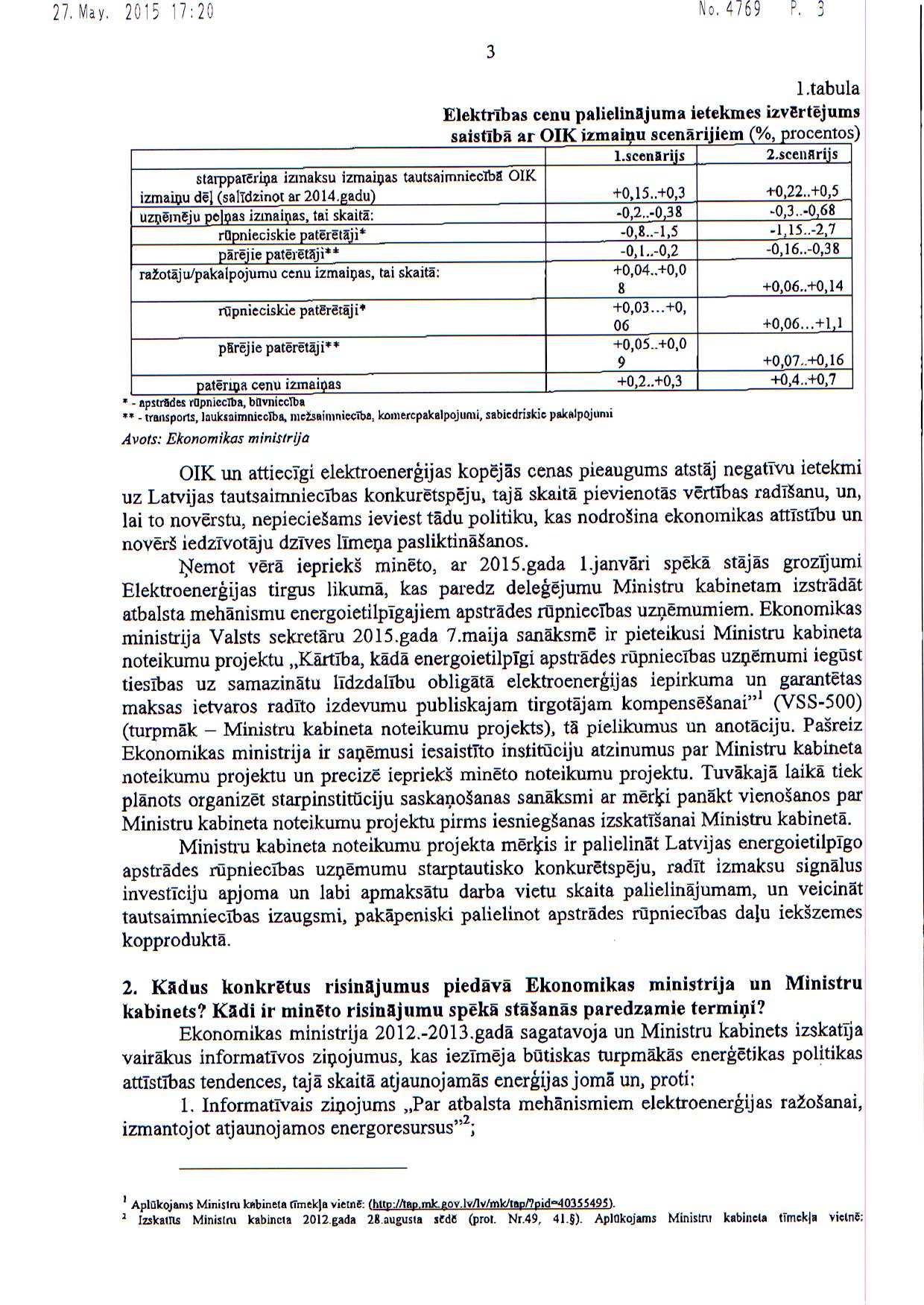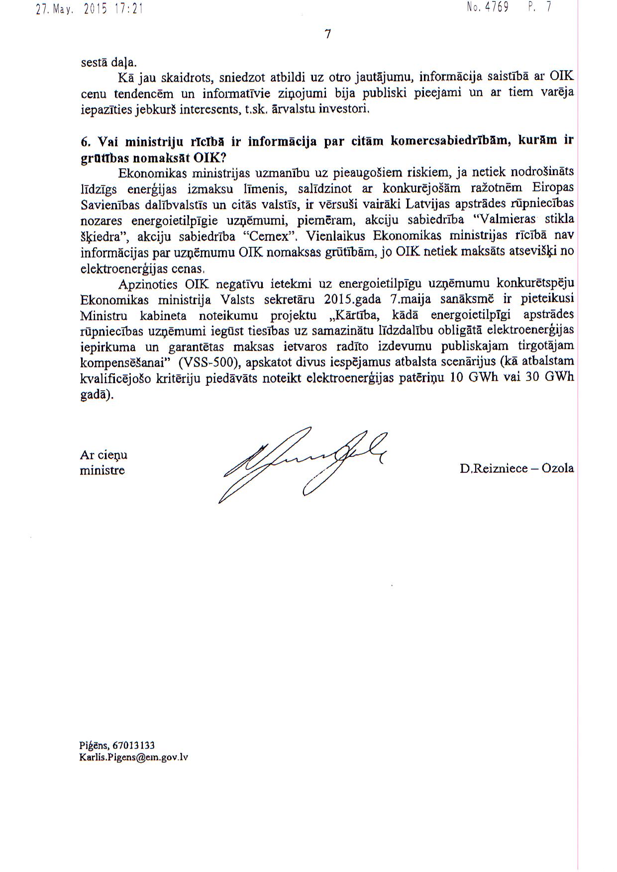 Jāteic, ka tāda prakse tiek īstenota: ja nav konkrēti minēts izpildes termiņš, tad Valsts kanceleja sūta ar premjera rezolūciju atgādinājumu par neizpildi. Pēc šī atgādinājuma izpildītājs lūdz termiņu pagarināt. Un tad biežāk ir tā, ka tas jautājums tiek skatīts nevis Ministru kabineta sēdē speciāli, bet premjers (premjere – šajā situācijā) ar savu rezolūciju pagarina izpildes termiņu. Un tā tiek sekots līdzi pilnīgi visiem. Tie ir daudzi simti dažādu valdības uzdevumu dažādām ministrijām un resoriem, un, ja katrā valdības sēdē mēs tagad skatītu vairāk par 100 jautājumiem par termiņu pagarināšanu, tad tas būtu ļoti, ļoti neracionāls darbs. Līdz ar to premjere pagarina šos termiņus, un šis termiņa pagarinājums ir līdz 30.jūnijam, tas ir ar premjeres rezolūciju. Un, ja būtu rakstiski tas šeit minēts, mēs arī šīs rezolūcijas kopiju varētu pievienot.