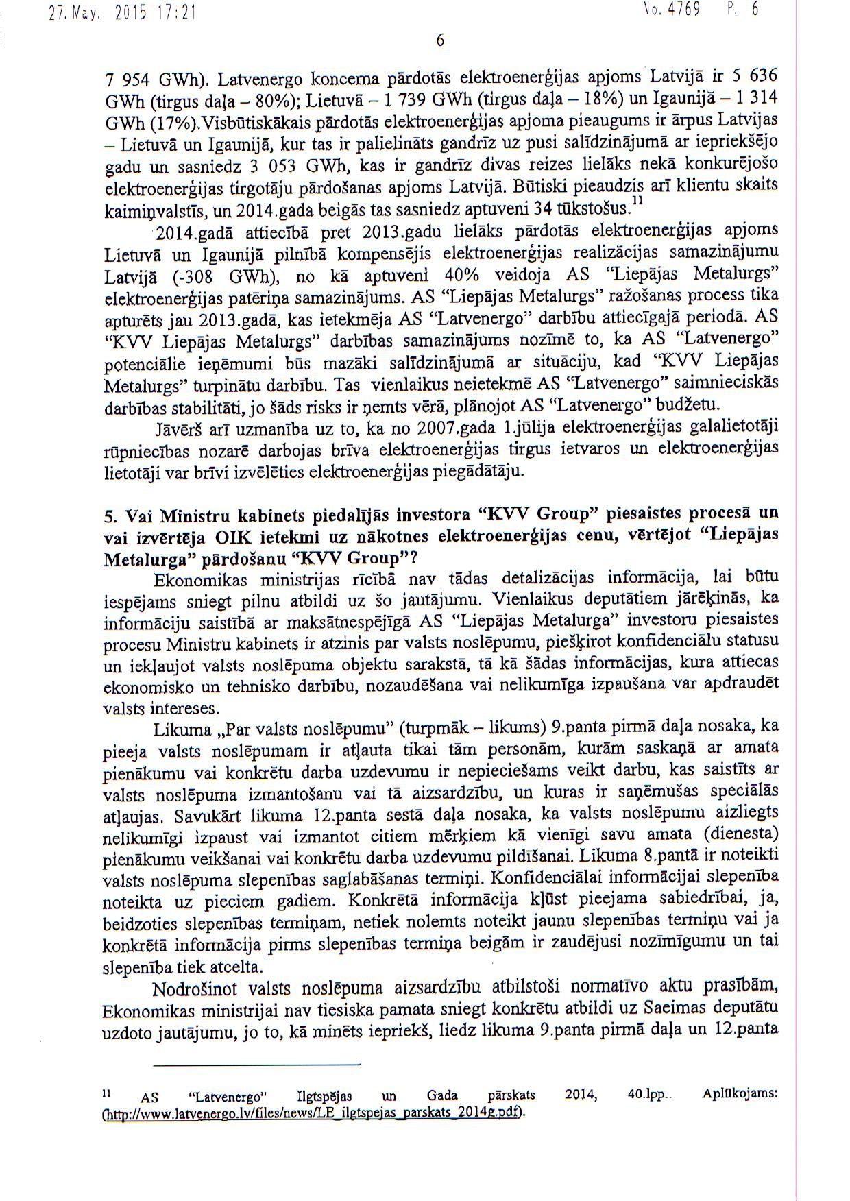 A.Platpers. Ministru kabineta 2014.gada 16.septembra sēdes protokola... es jau nesaukšu tagad, atkal tas pats ir... dotā uzdevuma izpildes termiņš precīzi nav noteikts. Tas nozīmē, ka atbilstoši Ministru kabineta Kārtības ruļļa 243.punktam dotais uzdevums ir izpildāms divu mēnešu laikā. Tātad noteiktais uzdevuma izpildes termiņš bija 2014.gada 16.novembris. Savā atbildē jūs minat, ka uzdevuma izpildes termiņš ir jūsu jau pieminētais 2015.gada 30.jūnijs.
