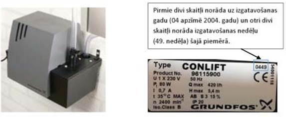 Produkts ir jānomaina, ja datums ir norādīts 0747 vai pirms šī datuma (47. nedēļa 2007. gads). Sīkākai produkta identifikācijai lietotāji var sazināties ar vietējo iekārtas uzstādītāju vai atrast papildu informāciju www.grundfos.com/conliftsafetywarning.html.
