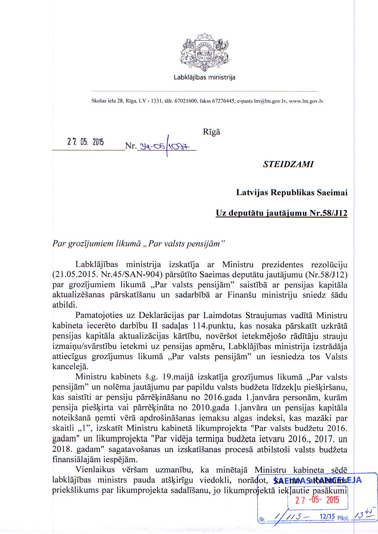 Ministra kungs, savā atbildē jūs norādījāt, ka 2015.gadā 180 miljoni eiro ir piešķirti jaunām politikas iniciatīvām. Varbūt jūs varētu pateikt, kādas no šīm iniciatīvām... kādi plānotie pasākumi tieši uzlabos pensiju jautājumu, kā arī būtiski cels – iespējams, cels – pensionāru dzīves līmeni, vēl jo vairāk tāpēc, ka tajā pensionāru grupā, kura pat nesasniedz minimālo iztikas minimumu, tas ir, pat neapliekamo minimumu – 235 eiro –, šī indeksācija nenotiek? Un kādos saprātīgos termiņos jūs plānojat izpildīt Satversmes tiesas spriedumu par visas šiem pensionāriem atņemtās daļas atdošanu saprātīgos termiņos?