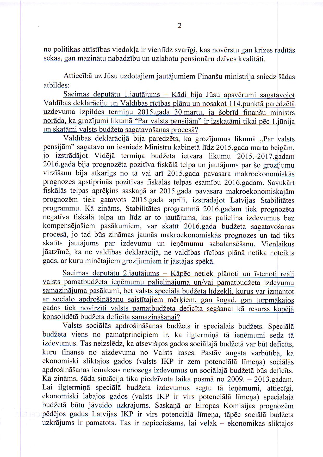 Kas attiecas uz jaunajām politikas iniciatīvām, ko jūs minējāt un kas bija 2015.gadā tādā apjomā, mēs zinām, ka 2015.gadā, protams, papildu līdzekļi bija nepieciešami... papildu līdzekļi arī indeksācijai, kura, tāpat kā pagājušajā gadā, notiks arī šogad. Vienīgā atšķirība no tā, ko mēs piedāvājām pensiju likuma grozījumos, – ka tā, tāpat kā pagājušajā gadā, būs gan ar algas pieauguma indeksu, gan ar inflācijas indeksu. Algas pieauguma indekss, tāpat kā pagājušajā gadā, būs 25 procenti, nevis 50 procenti. Mēs piedāvājām valdībai veikt grozījumus, lai jau šogad mēs varētu veikt šo indeksāciju ar 50 procentiem no algas pieauguma indeksa. To mēs rēķinājām; mēs to varam atļauties, redzot to, ka inflācija šobrīd attiecībā pret plānoto ir kritusies. Un budžetā šobrīd pie esošās likuma redakcijas ir ietaupījums (ieņēmumi pret izdevumiem, pret plānoto budžetā) – 8,8 miljoni.