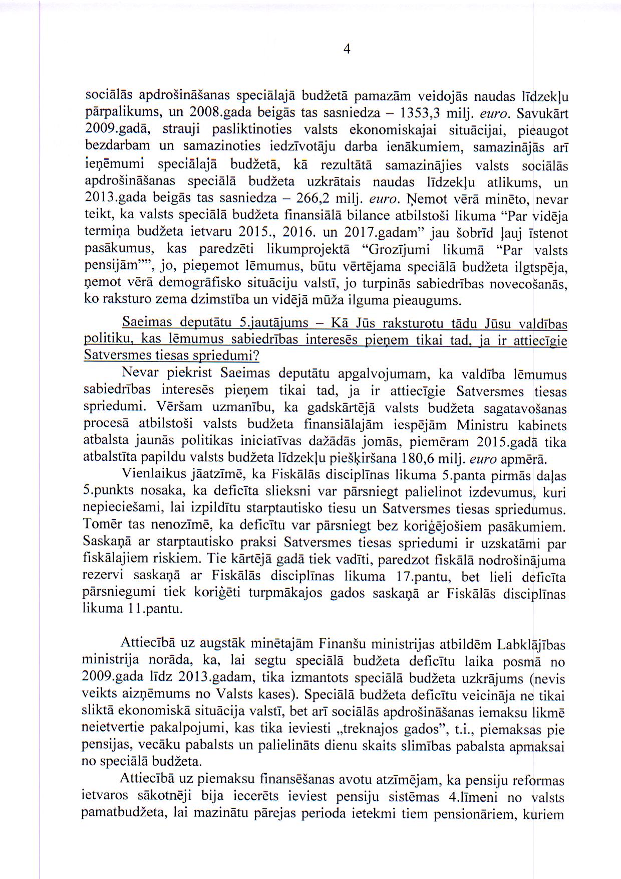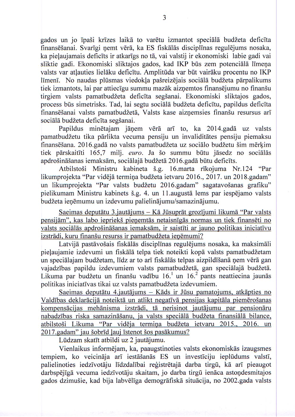 Nu, mēs tomēr uzskatām, ka mēs neesam saņēmuši atbildi pēc būtības uz mūsu trešo jautājumu, tāpēc lūdzam jūs sniegt skaidrojumu, kā jūs vērtējat situāciju, ka, lai labotu iepriekš pieņemtu netaisnīgu normu, Ministru kabinets nerīkojas atbilstoši un godprātīgi un neatjauno sociālo taisnīgumu, un nepalielina valsts speciālā budžeta bāzi?