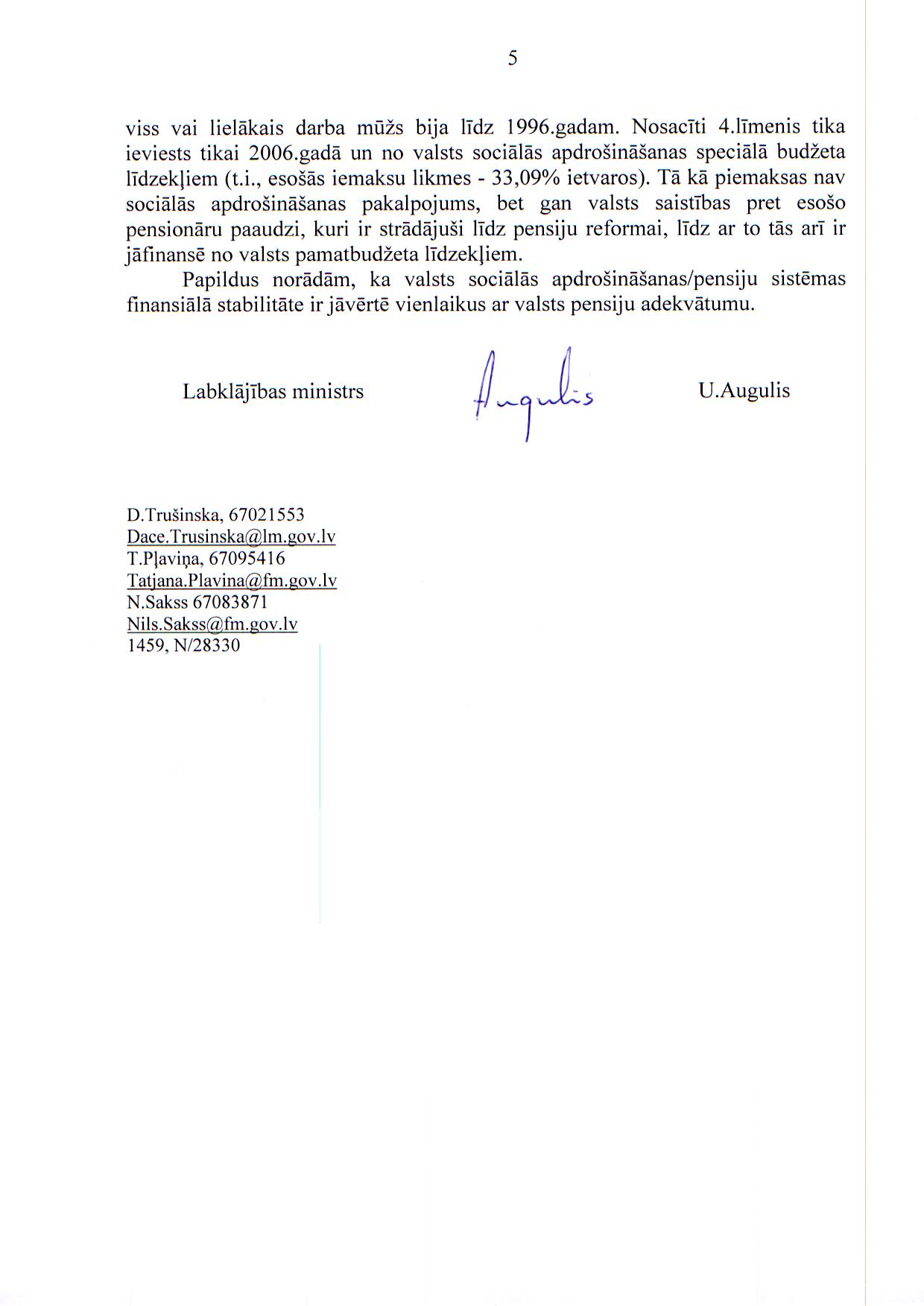 Jā, manā atbildes vēstulē (man ar rezolūciju ir uzdevusi Ministru prezidente atbildēt), kura sastāv no divām daļām (viens ir Labklājības ministrijas viedoklis), skaidri ir redzams, ka man ir bijis savādāks viedoklis šinī Ministru kabineta sēdē nekā kopumā valdībai, tāpēc arī valdības protokolam ir pievienots klāt mans īpašais viedoklis. Labklājības ministram ir atsevišķs viedoklis par to, kādā veidā tiek uzkrāts un tiek lietots uzkrātais speciālā budžeta finansējums. Šobrīd mans, ministra, viedoklis atšķiras no valdības viedokļa. Arī valdībā mans... viens no uzstādījumiem bija tas, ka mums ir vairāk jādomā nevis par to, kā mēs pārdalām dažādu budžetu resursus, bet par to, kā mēs pamatbudžetā veicinām, lai mēs pēc iespējas vairāk nopelnītu.