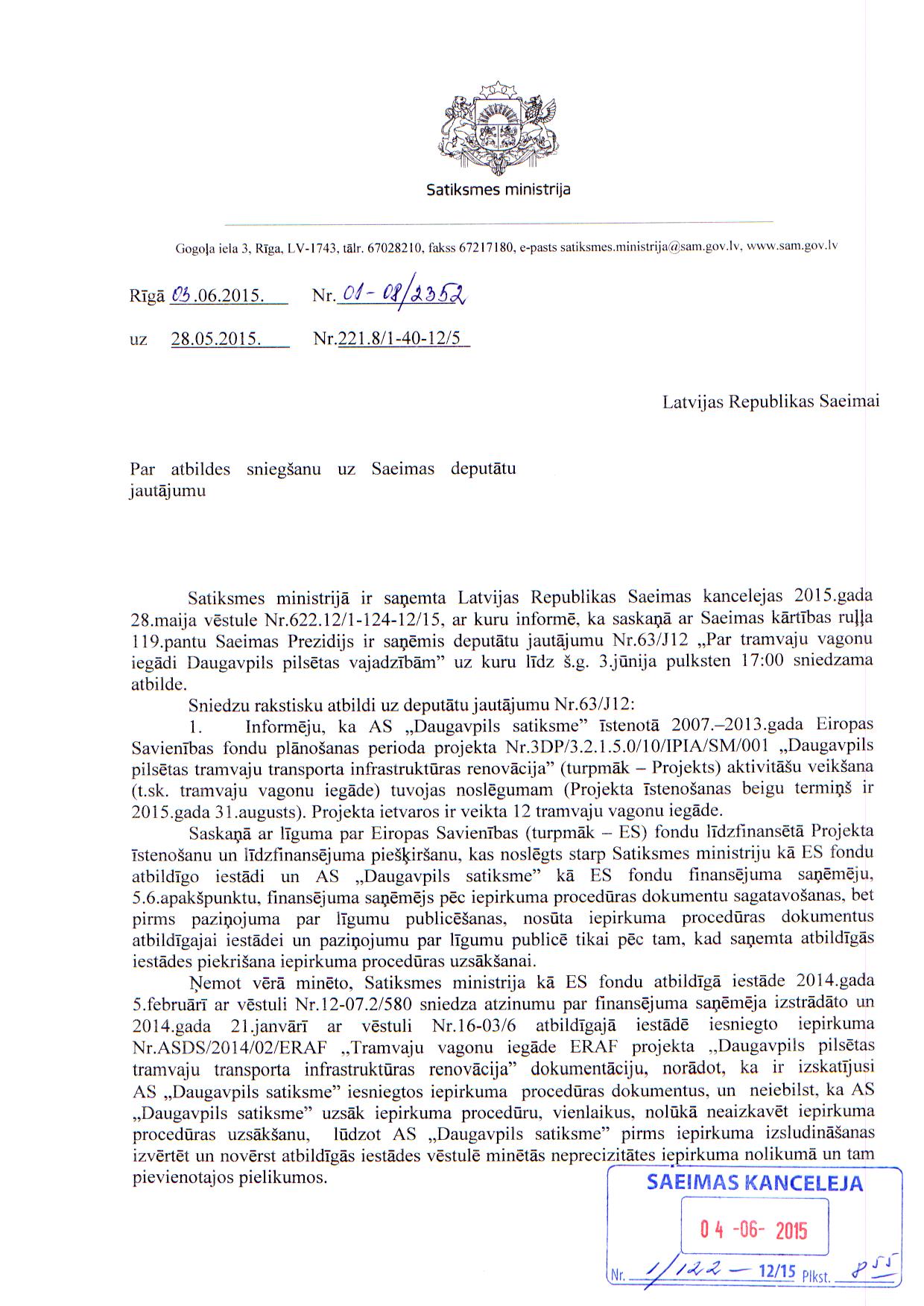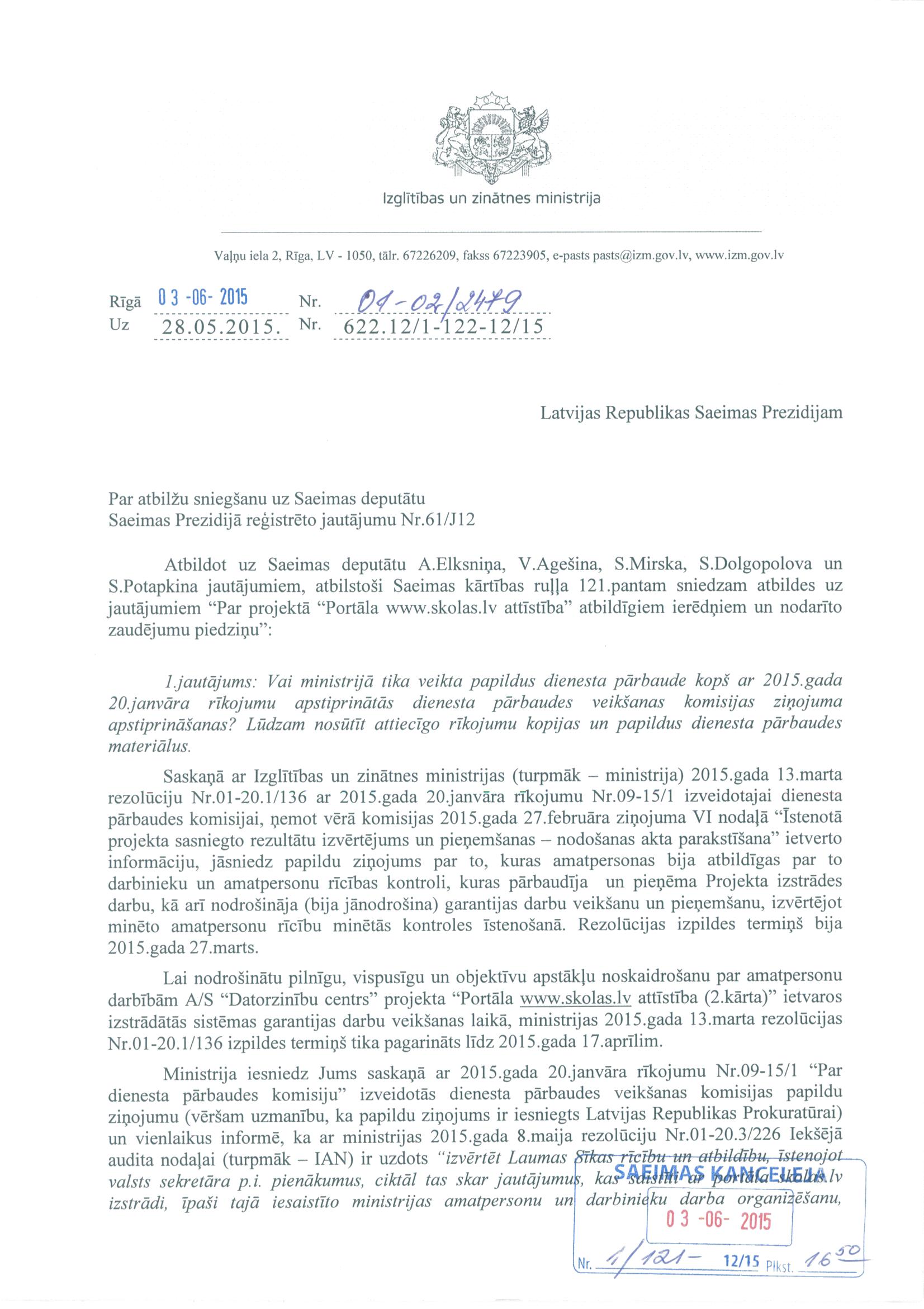 Atbildes uz deputātu jautājumiem 2015.gada 4.jūnijā