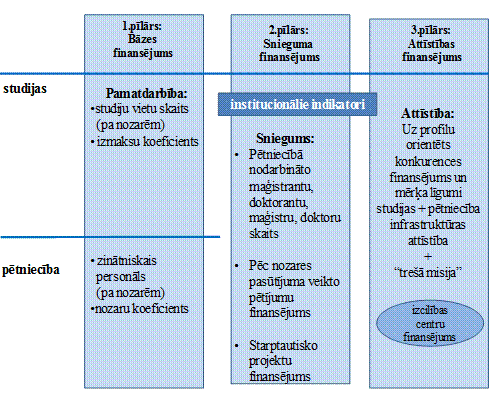 Ieviešot jauno trīs pīlāru modeli, kurā valsts budžeta līdzekļi tiek piešķirti gan stabilitātes nodrošināšanai, gan arī stratēģisku mērķu sasniegšanai, un Eiropas Savienības struktūrfondu līdzekļi tiek novirzīti augstākās izglītības institūciju rīcībspējas paaugstināšanai, augstākās izglītības sektoram tiks dota iespēja nodrošināt Latvijas sabiedrības un tautsaimniecības attīstības vajadzībām atbilstošu modernu, pētniecībā balstītu augstāko izglītību.