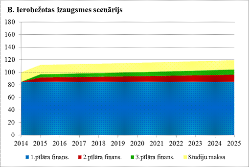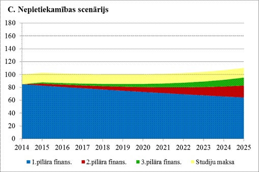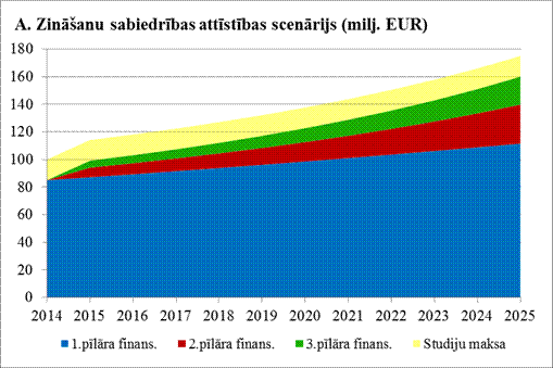 Ņemot vērā pieejamo līdzekļu apjomu augstākajai izglītībai un pētniecībai, kā arī Pasaules Bankas rekomendācijas, ministrijas noteiktā augstākās izglītības finansēšanas reformas īstenošanas stratēģija atbilst Zināšanu sabiedrības attīstības scenārijam, nodrošinot mērķtiecīgu finansējuma palielinājumu pētniecībā balstītai augstākajai izglītībai un ieviešot ieteikto trīs pīlāru modeli. Jauna finansēšanas modeļa ieviešanai atbilstoši Pasaules Bankas izstrādātajam Zināšanu sabiedrības attīstības scenārijam kopējais papildus nepieciešamais valsts budžeta finansējums 2016. gadā ir 11 792 000 euro, 2017. gadā – 15 251 000 euro, 2018. gadā – 18 930 000 euro. No minētā Izglītības un zinātnes ministrijai papildus nepieciešamais finansējums valsts budžeta programmas 03.00.00 "Augstākā izglītība" apakšprogrammā 03.01.00 "Augstskolas" 2016. gadā ir 2 188 000 euro, 2017. gadā – 3 353 000 euro, 2018. gadā – 4 547 000 euro; apakšprogrammā 03.03.00 "Zinātniskās darbības attīstība augstskolās un koledžās" 2016. gadā – 1 550 000 euro, 2017. gadā – 2 760 000 euro, 2018. gadā – 4 150 000 euro; apakšprogrammā 03.11.00 "Koledžas" 2016. gadā – 455 000 euro, 2017. gadā – 714 000 euro, 2018. gadā – 979 000 euro; budžeta programmas 05.00.00 "Zinātne" apakšprogrammā 05.02.00 "Zinātnes bāzes finansējums" (augstskolām) 2016. gadā – 6 080 000 euro, 2017. gadā – 6 095 000 euro, 2018. gadā – 6 095 000 euro. Veselības ministrijai papildus nepieciešamais finansējums budžeta programmas 02.00.00 "Medicīnas izglītība" apakšprogrammā 02.03.00 "Augstākā medicīnas izglītība" (tikai augstākās izglītības finansējums) 2016. gadā ir 760 000 euro, 2017. gadā – 1 165 000 euro, 2018. gadā – 1 580 000 euro. Zemkopības ministrijai papildus nepieciešamais finansējums budžeta programmas 22.00.00 "Cilvēkresursu attīstība" apakšprogrammā 22.02.00 "Augstākā izglītība" 2016. gadā ir 373 000 euro, 2017. gadā – 572 000 euro, 2018. gadā – 776 000 euro. Kultūras ministrijai papildus nepieciešamais finansējums budžeta programmā 20.00.00 "Kultūrizglītība" (tikai augstākās izglītības finansējums) 2016. gadā ir 386 000 euro, 2017. gadā – 592 000 euro, 2018. gadā – 803 000 euro.