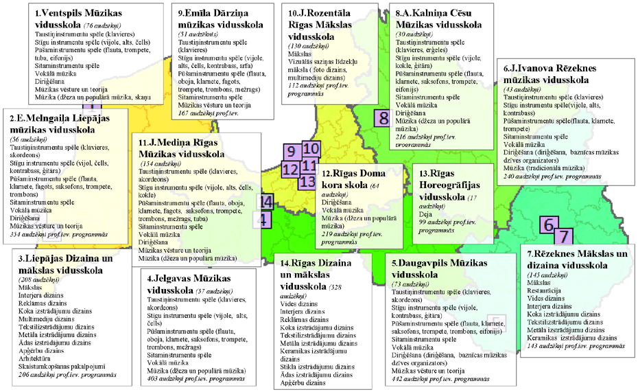 Saskaņā ar CSP datiem5 2015. gadā Latvijā vecuma grupā no 15 līdz 19 gadiem būs 93 788 iedzīvotāji (2011.gadā šajā vecuma grupā bija 120 371, 2009.gadā – 156 053 iedzīvotāji). Ievērojot minēto, vecuma grupā no 15 līdz 19 gadiem samazinājums 2015.gadā paredzams 40 %. Kaut demogrāfiskā tendence ir negatīva, izglītības sektoram ir jānodrošina stabils speciālistu papildinājums tautsaimniecībai. Optimizējot profesionālās izglītības iestādes un vienlaikus modernizējot tās, tiktu samazināts profesionālās izglītības iestāžu skaits, rezultātā nodrošinot lielāku izglītojamo skaitu katrā izglītības iestādē. Lai arī valstī demogrāfiskā tendence ir negatīva, pēdējos 3 – 5 gados mākslas un mūzikas vidusskolās audzēkņu kopskaits būtiski nesamazinās6 (pielikuma 1. zīmējums (tabula)), kā arī iestājeksāmenu konkursam vidējā profesionālajā kultūrizglītībā ir stabila vai pat nedaudz augoša tendence (2011./2012.gadā 1.kursā tika uzņemti 480 audzēkņi, 2012./2013.mācību gadā – 465, 2013/2014.mācību gadā – 481, 2014./2015.mācību gadā – 492 audzēkņi7). Tas rāda noturīgu sabiedrības pieprasījumu pēc kvalitatīvas kultūrizglītības, kas tiek piedāvāta mākslas un mūzikas vidusskolās. Koncepcijas pielikuma 4. zīmējums (grafiks) parāda mākslas un mūzikas vidusskolu pārklājumu Latvijā, demonstrējot, ka piedāvājums mūzikā ir nodrošināts visos reģionos, savukārt profesionālā vidējā izglītība dejā iegūstama vienīgi Rīgā.