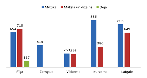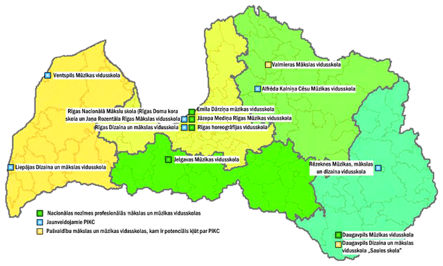 Rīgā ir visaugstākā kultūras un radošo industriju uzņēmumu un radošā potenciāla kritiskā masa10 un lielākais šā segmenta darba tirgus. Rīgā darbojas valsts teātri un koncertorganizācijas, privātās mākslas galerijas, kā arī trīs kultūrizglītības augstskolas un koledža. Tādējādi mākslas un mūzikas vidusskolu absolventiem ir visplašākās iespējas turpināt izglītības iespējas augstskolās, kā arī darba iespējas profesionālajos mūzikas kolektīvos, dramatiskajos teātros, Latvijas Nacionālā opera (turpmāk – LNO) u.c. Ventspilī ir labi attīstīts mācību prakšu vietu un kultūras industriju institūciju tīkls – aktīvi darbojas Ventspils Augstskola (turpmāk – VeA), Pārventas bibliotēka ar koncertzāli, teātra nams "Jūras vārti", ir atjaunots Latviešu biedrības nams un Kultūras centrs. Ventspils kultūrizglītības iestāžu audzēkņiem ir iespēja izmantot prakšu vietas Liepājā. Liepāja ir pilsēta ar stabilām mākslas un izglītības saknēm un senām kultūras tradīcijām. LiepU darbojas multimediju katedra un mākslas pētījumu laboratorija, tiek būvēta jauna koncertzāle un darbojas Liepājas teātris, Liepājas simfoniskais orķestris un citas kultūras industrijas institūcijas. Tas rada darba tirgus apstākļus profesionāliem mūziķiem un skatuves māksliniekiem, kā arī tālākas izglītības iespējas LiepU, kur multimediju dizaina studiju programmā tiek sagatavoti dizaineri, mūziķi un citas mākslas nozares profesijas. Rēzekne pilsētas attīstības stratēģijā ir iezīmējusi radošās industrijas kā vienu no pilsētas attīstības primārajiem faktoriem. Rēzeknē mērķtiecīgi tiek veidots kultūras un radošo industriju darba tirgus, Rēzeknes daudzfunkcionālais kultūras centrs "Latgales vēstniecība GORS" var nodrošināt mācību prakses un praktisku mācību iespēju mūzikā, kā arī ir pieejamas daudzpakāpju izglītības iespējas dizainā un mākslā, kas iegūstama interešu izglītības centrā "Zeimuļs", dizaina speciālista kvalifikāciju – Rēzeknes Dizaina un mākslas vidusskolā, savukārt profesionālo augstāko izglītību interjera dizainā – Rēzeknes Augstskolā. Rēzeknes Mākslas un dizaina vidusskolas ēkā ir izvietota arī LMA filiāle.