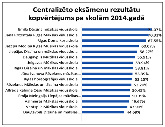 2011. gadā veiktajā pētījumā "Skolu reitings 2011"8 par labākajām ir atzītas KM padotības profesionālās izglītības iestādes. Valsts un centralizēto eksāmenu rezultāti mūzikas un mākslas vidusskolās ir starp augstākajiem vidēji valstī un kopumā pārsniedz vidējos rādītājus starp profesionālās vidējās izglītības iestādēm. 2014. gadā savas kategorijas izglītības iestāžu grupā ar vidējo rezultātu 74,07% pirmo vietu ieņēma Dārziņa Mūzikas vidusskola, otro vietu – Rozentāla Mākslas vidusskola ar 70,31% un trešo vietu – Doma kora skola ar 67,55%. Pirmajā desmitniekā ierindojās arī Mediņa Rīgas Mūzikas vidusskola, Liepājas Dizaina un mākslas vidusskola, Daugavpils Mūzikas vidusskola, Jelgavas Mūzikas vidusskola u.c. (pielikuma 5. zīmējums (grafiks)). Pēdējo divu mācību gadu laikā lielākajai daļai no profesionālo kvalifikāciju ieguvušajiem audzēkņiem vērtējums profesionālās kvalifikācijas eksāmenos ir septiņas balles un augstāk (LNKC dati, 08.08.2014.).