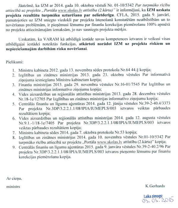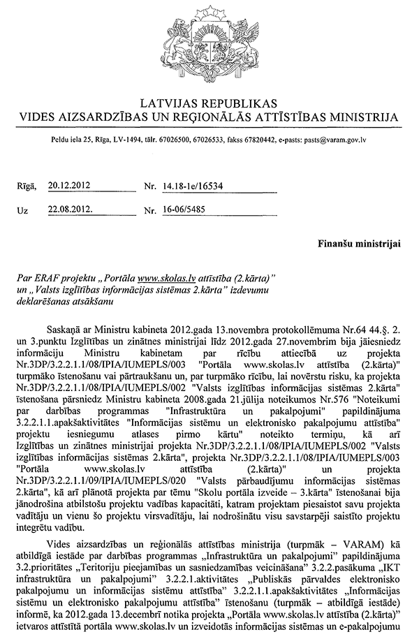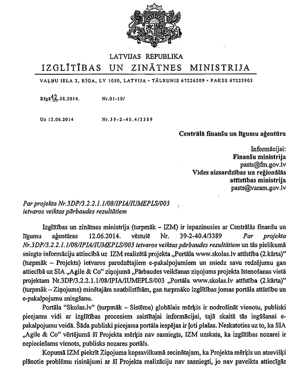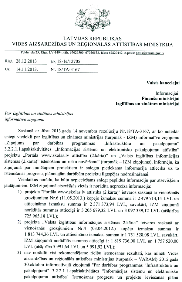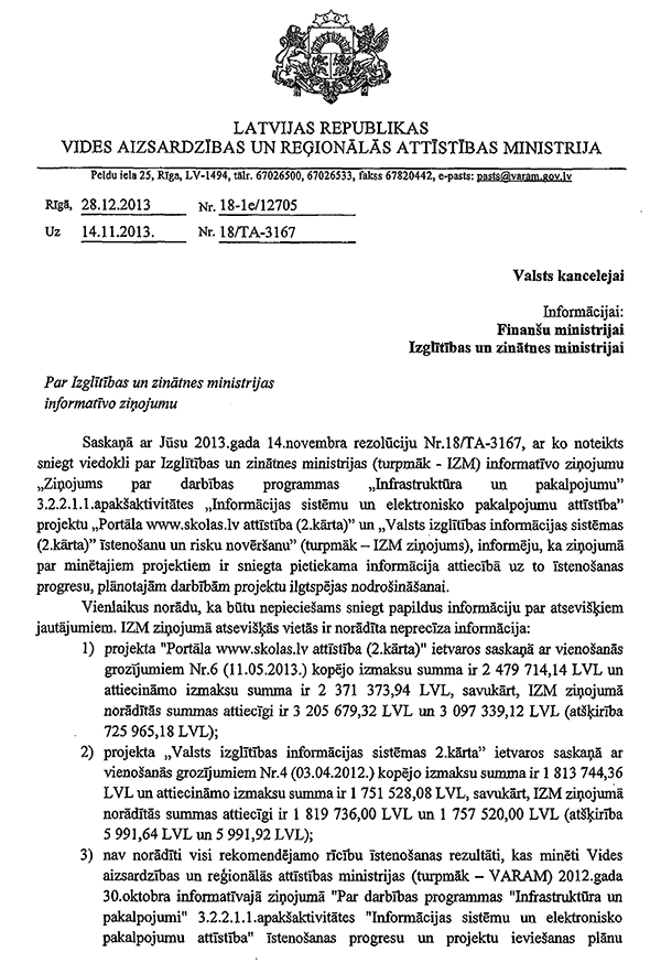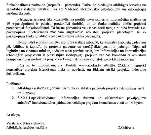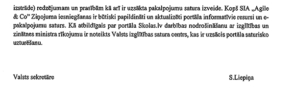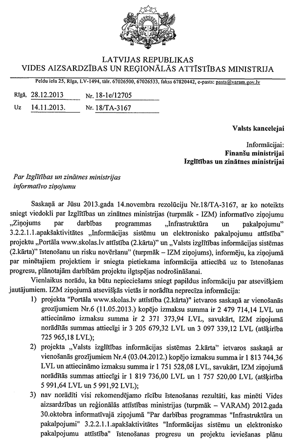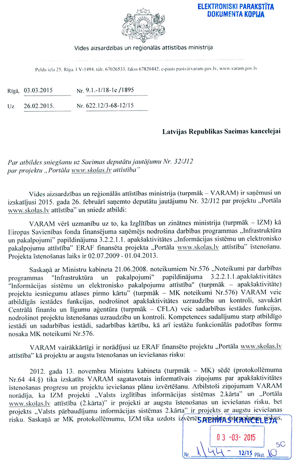 Uz deputātu Ločmeles-Luņovas, Elksniņa, Ņikiforova, Ādamsona un Artūra Rubika jautājumu vides aizsardzības un reģionālās attīstības ministram Kasparam Gerhardam "Par projektu "Portāla www.skolas.lv attīstība"" saņemtā rakstveida atbilde iesniedzējus apmierina.