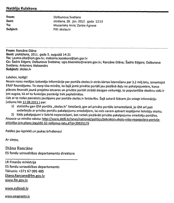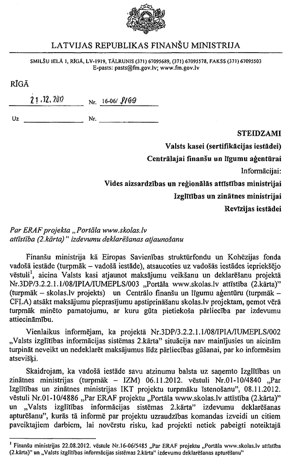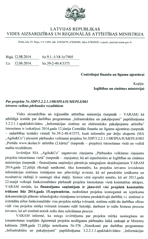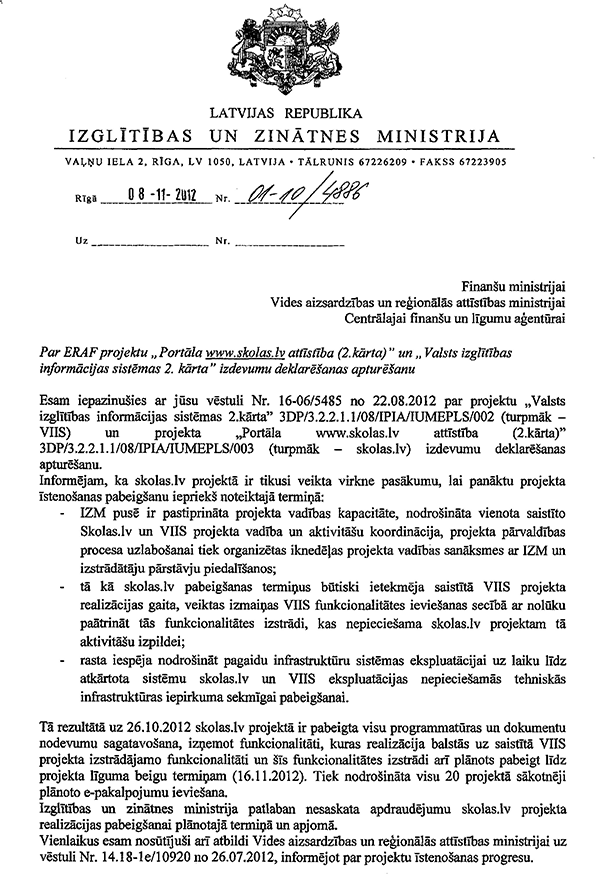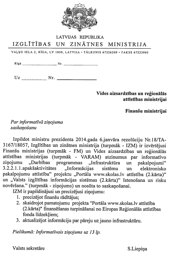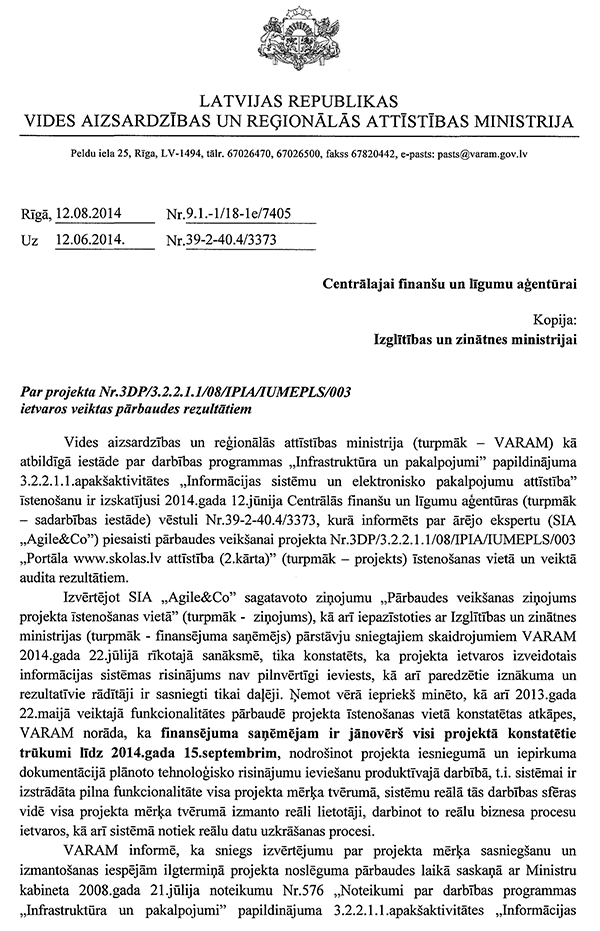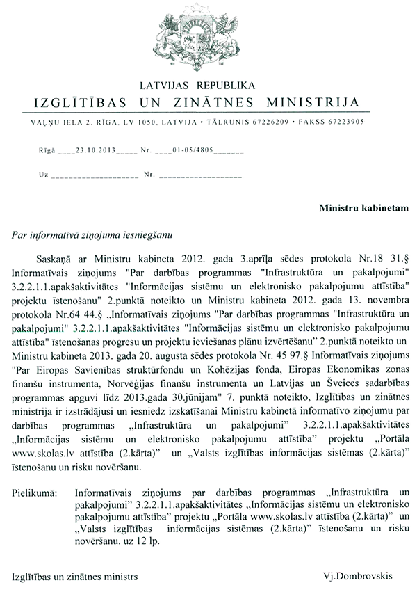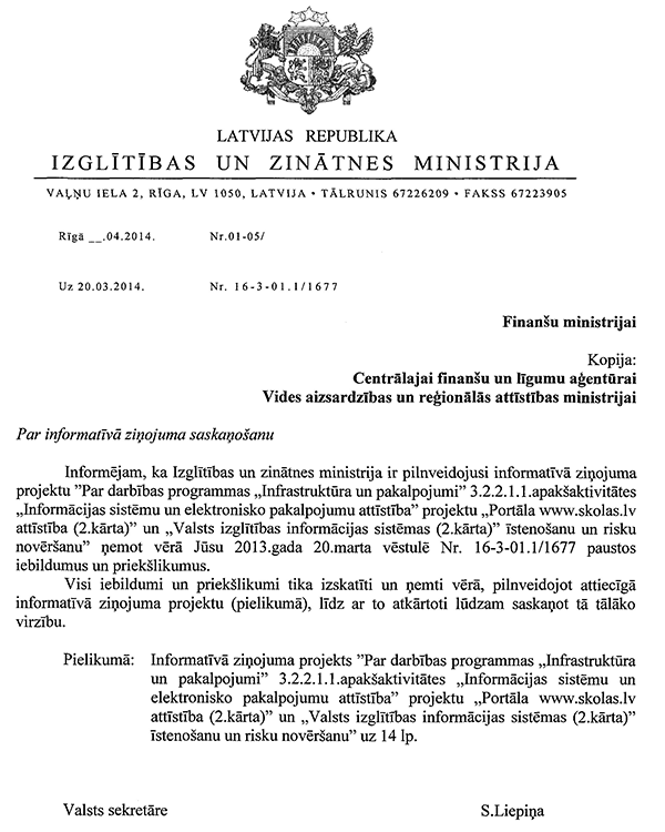 Uz deputātu Ločmeles-Luņovas, Elksniņa, Ņikiforova, Ādamsona un Artūra Rubika jautājumu vides aizsardzības un reģionālās attīstības ministram Kasparam Gerhardam "Par projektu "Portāla www.skolas.lv attīstība"" saņemtā rakstveida atbilde iesniedzējus apmierina.