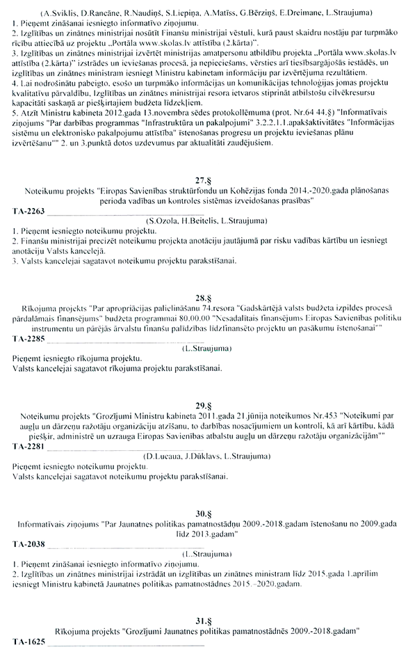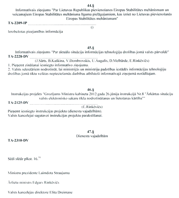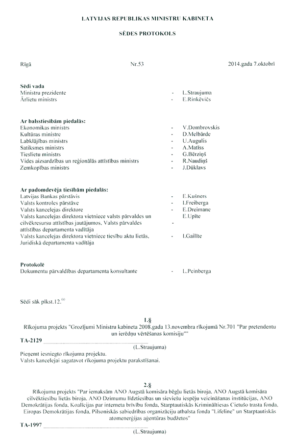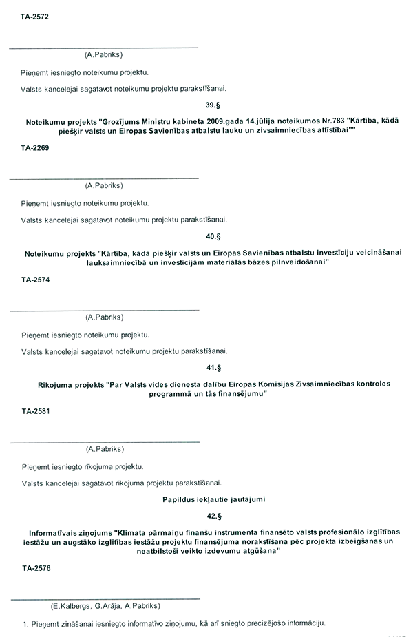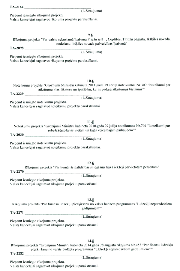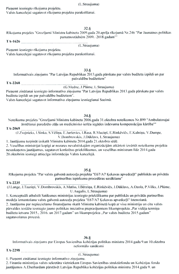 Cienījamie kolēģi! Šodien nav reģistrējušies: Hosams Abu Meri... ir, Mārtiņš Bondars (No zāles: "Ir!"), Boriss Cilevičs, Lolita Čigāne, Jānis Dombrava, Ojārs Ēriks Kalniņš, Māris Kučinskis, Aivars Meija, Romāns Naudiņš, Vladimirs Nikonovs, Sergejs Potapkins, Romualds Ražuks, Ivans Ribakovs, Veiko Spolītis, Jānis Trupovnieks un Ilze Viņķele.