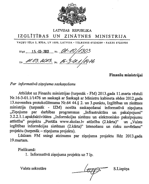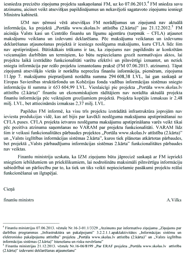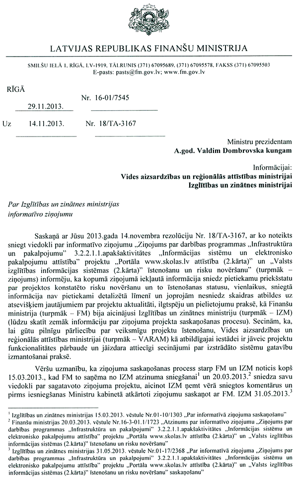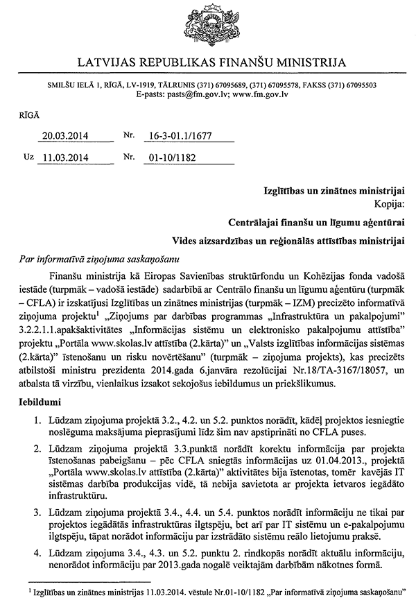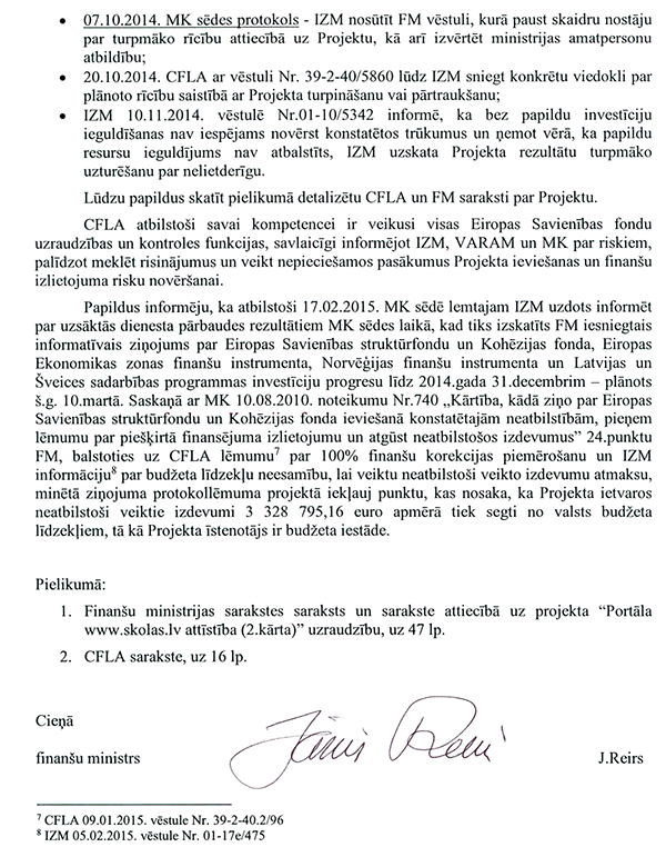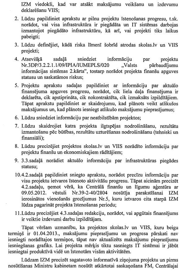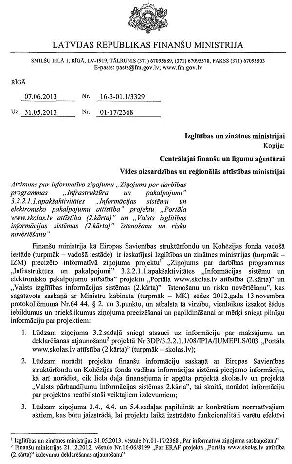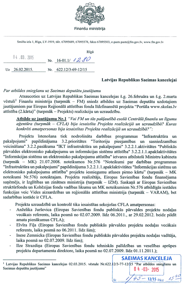 Uz deputātu Ločmeles-Luņovas, Elksniņa, Ņikiforova, Ādamsona un Artūra Rubika jautājumu finanšu ministram Jānim Reiram "Par projektu "Portāla www.skolas.lv attīstība"" saņemta rakstveida atbilde, kura iesniedzējus apmierina. Ministrs informē, ka var šodien ierasties uz mutvārdu atbildes sniegšanu, bet saņemtā atbilde jau tātad jautātājus apmierina.