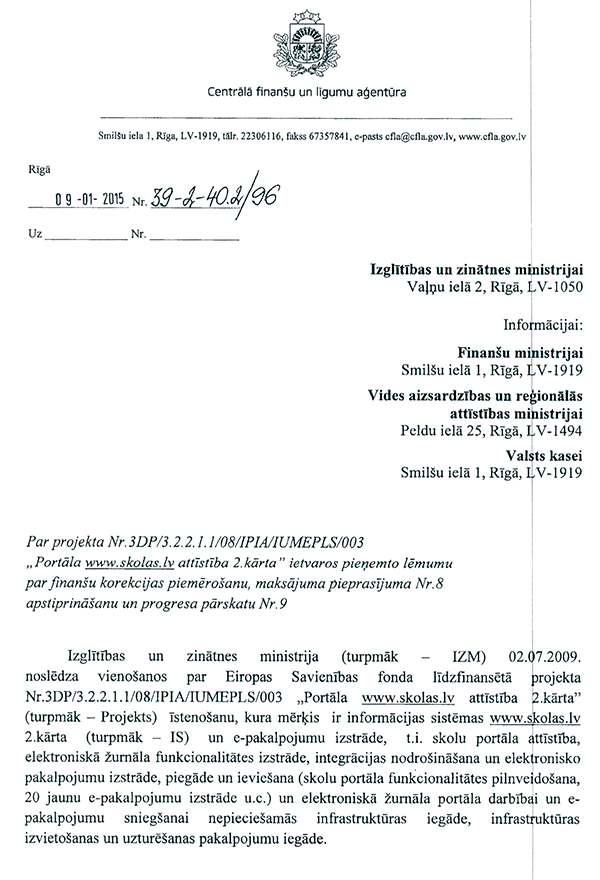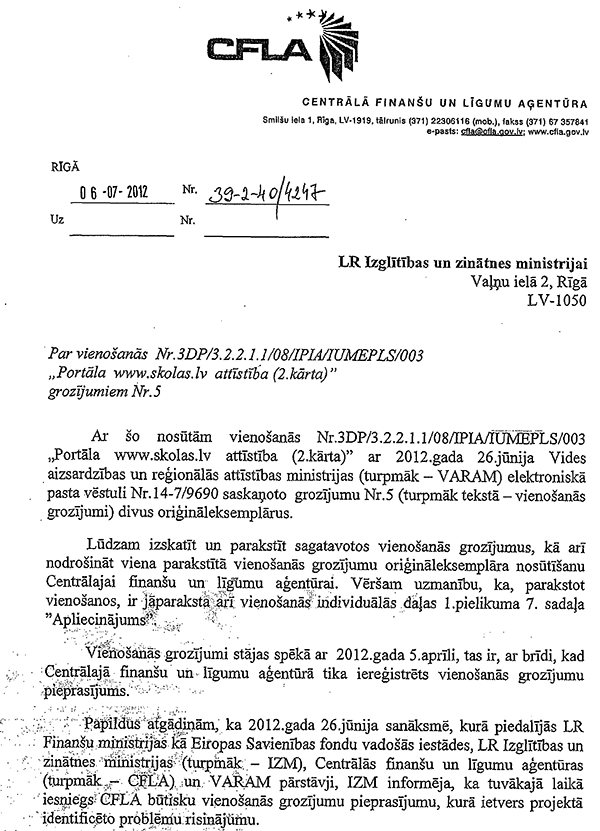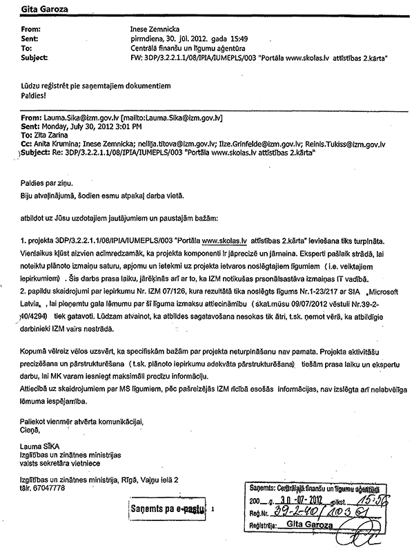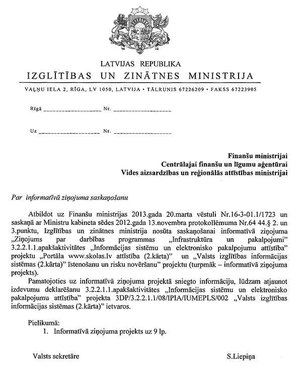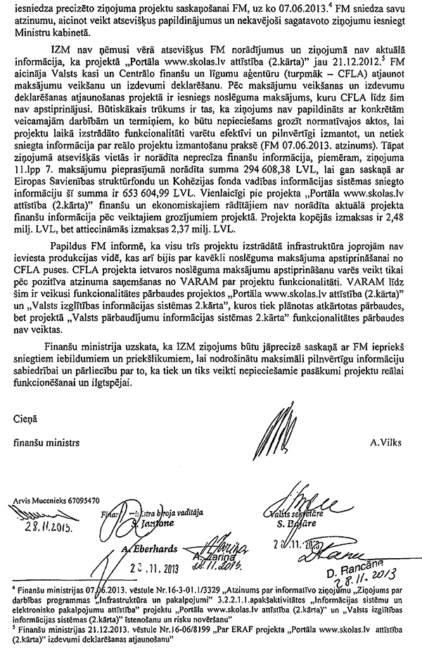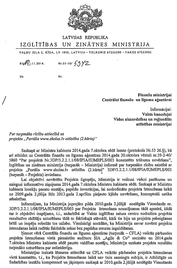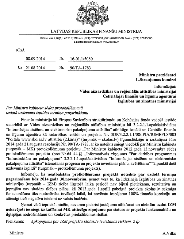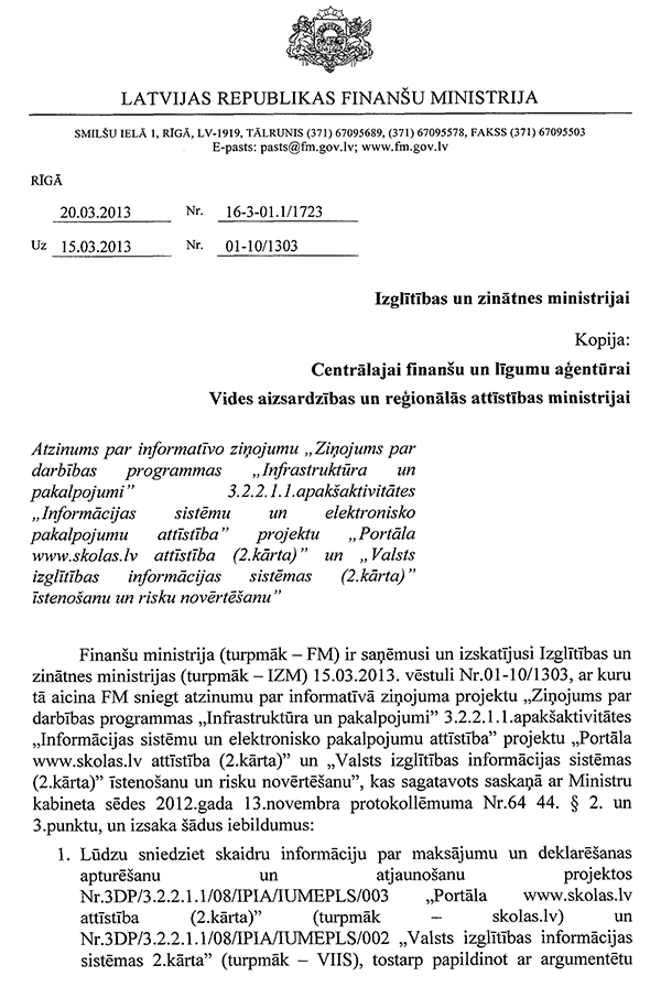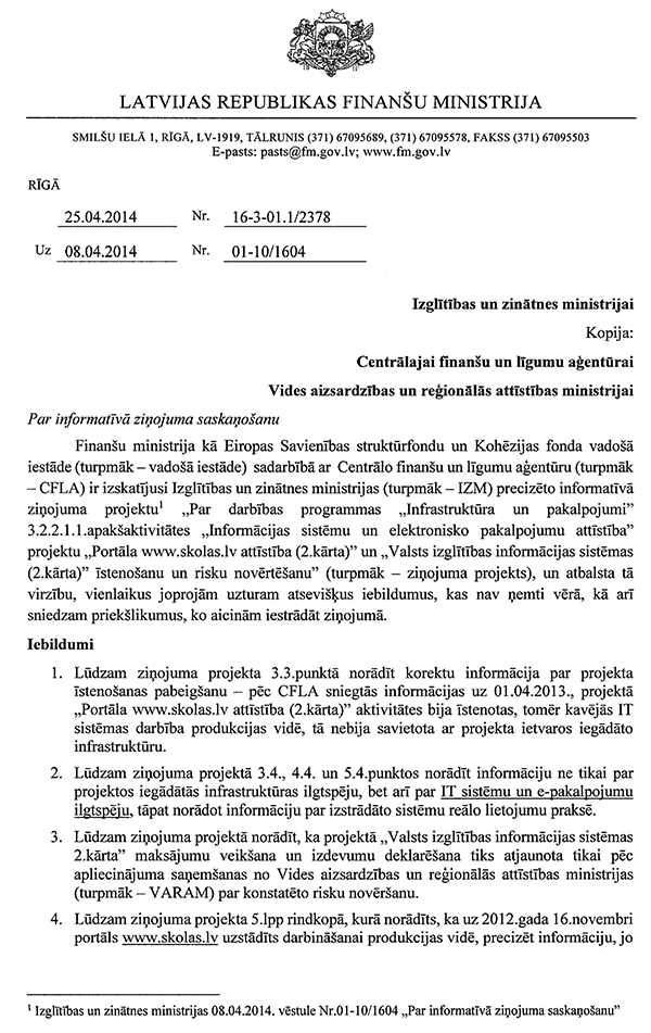 Uz deputātu Ločmeles-Luņovas, Elksniņa, Ņikiforova, Ādamsona un Artūra Rubika jautājumu finanšu ministram Jānim Reiram "Par projektu "Portāla www.skolas.lv attīstība"" saņemta rakstveida atbilde, kura iesniedzējus apmierina. Ministrs informē, ka var šodien ierasties uz mutvārdu atbildes sniegšanu, bet saņemtā atbilde jau tātad jautātājus apmierina.