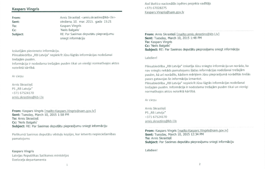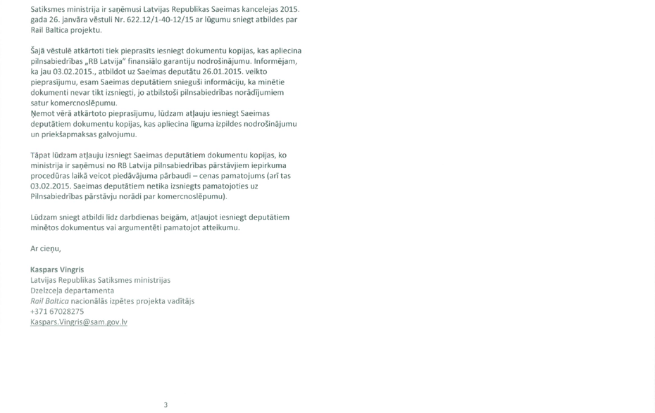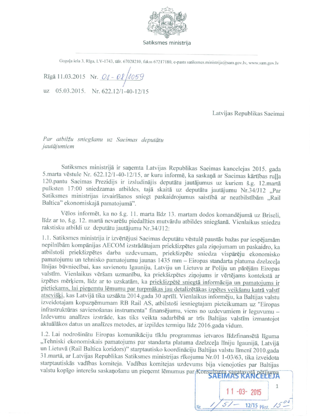 Un ceturtais ir deputātu Zariņa, Agešina, Artūra Rubika, Tutina un Pimenova jautājums satiksmes ministram Anrijam Matīsam "Par Satiksmes ministrijas izvairīšanos sniegt paskaidrojumus saistībā ar neatbilstībām Rail Baltica ekonomiskajā pamatojumā". Uz šo jautājumu ir saņemta rakstveida atbilde, kas apmierina jautājuma iesniedzējus. Līdz ar to jautājums uzskatāms par atbildētu.
