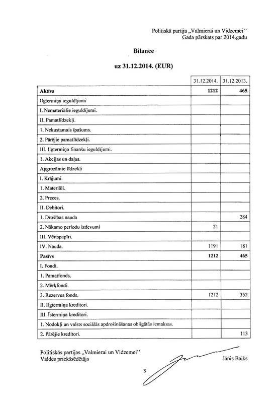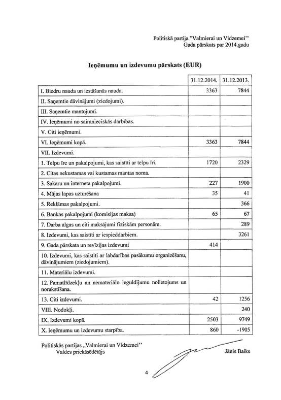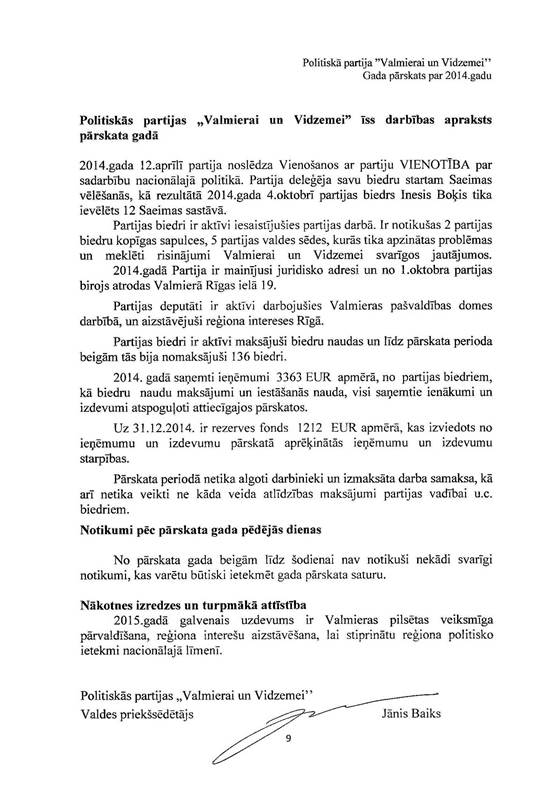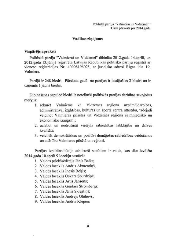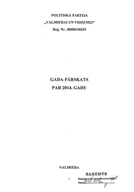 Politiskās partijas "Valmierai un Vidzemei", reģ.Nr.40008196025, gada pārskats par 2014.gadu