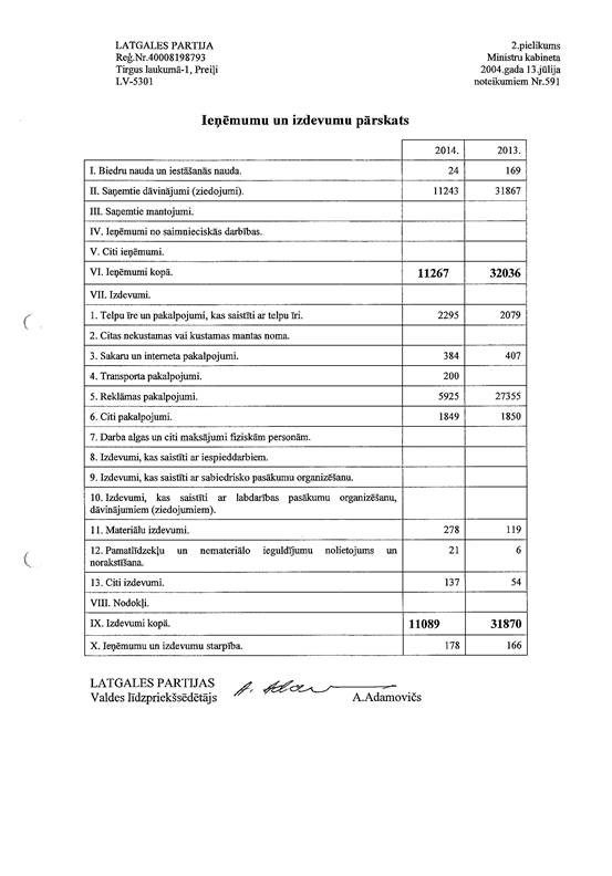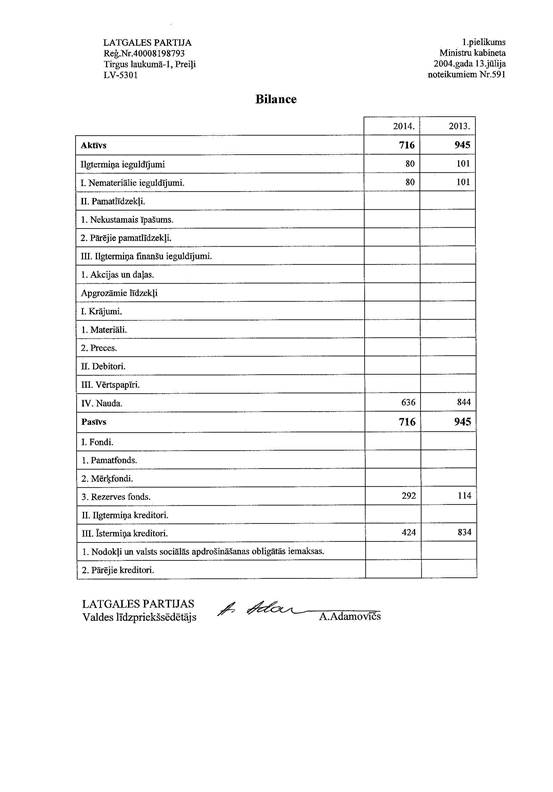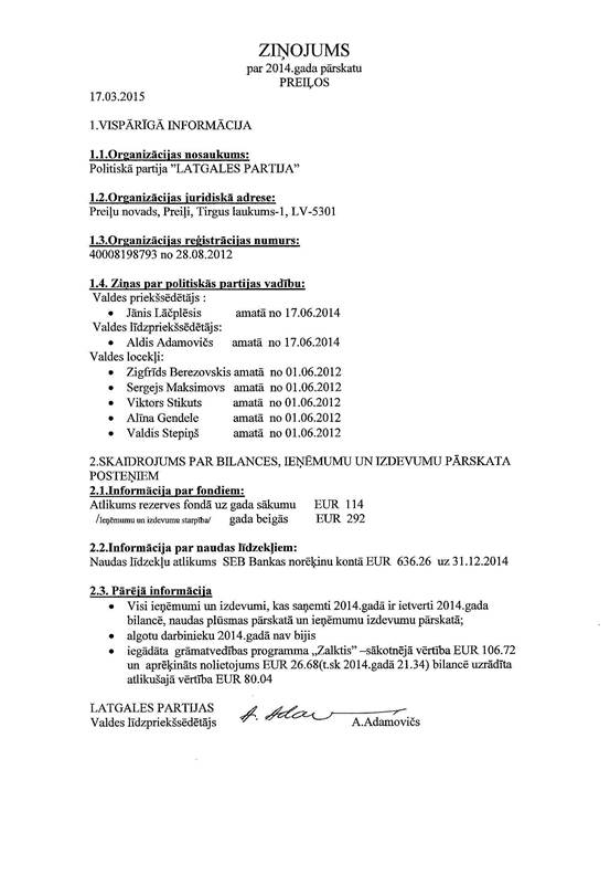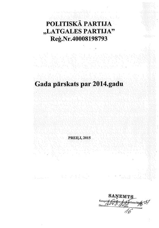 Politiskās partijas "LATGALES PARTIJA", reģ. Nr. 40008198793, gada pārskats par 2014.gadu