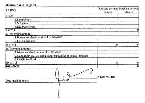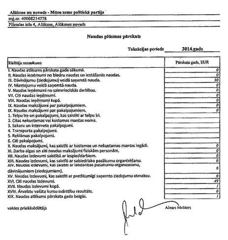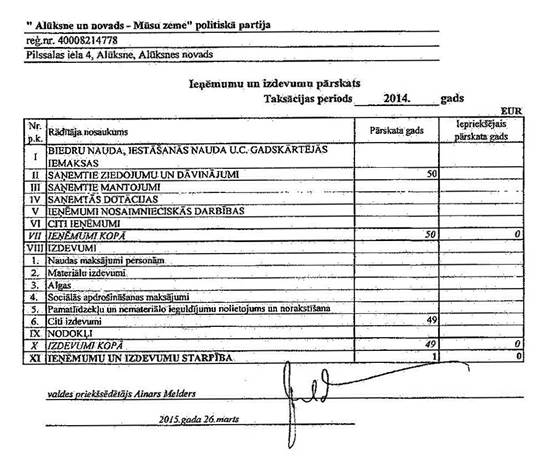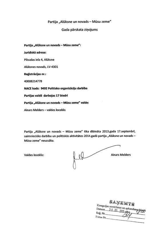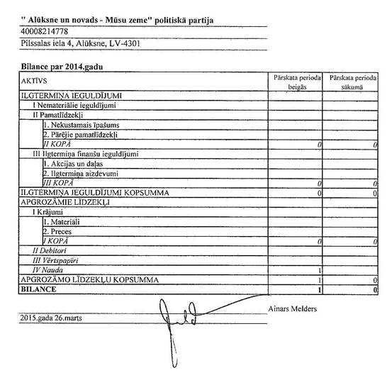 Politiskās partijas "Alūksne un novads - mūsu zeme", reģ. Nr. 40008214778, gada pārskats par 2014.gadu